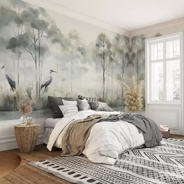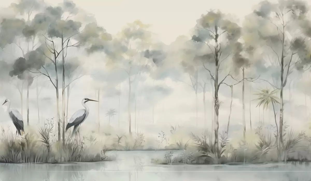 Fototapety Zamlžený les u vody s volavkami, jemná chladná paleta barev Č. w04788