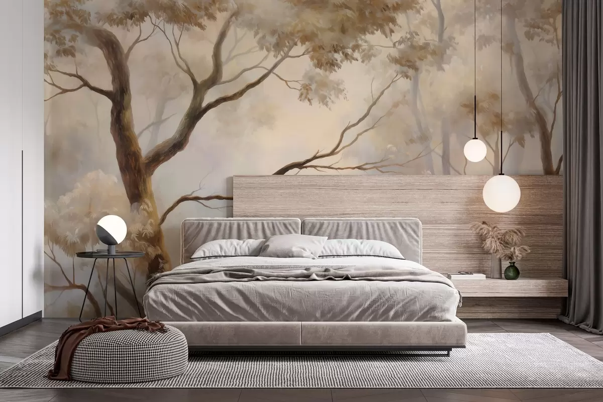 Fototapety Les v lehké ranní mlze. Jemný atmosférický obraz ve stylu umělecké krajiny. Č. w04817