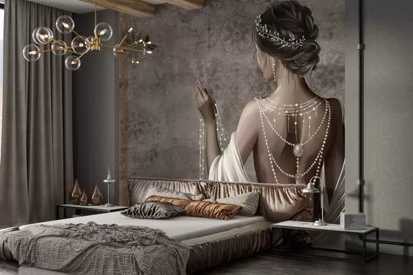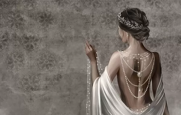 Fototapety Žena viděná zezadu s perlami, šedé pozadí s kamenným vzorem Č. w04854