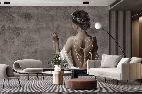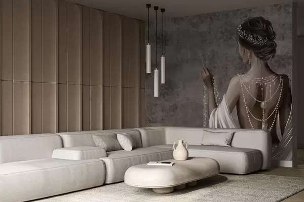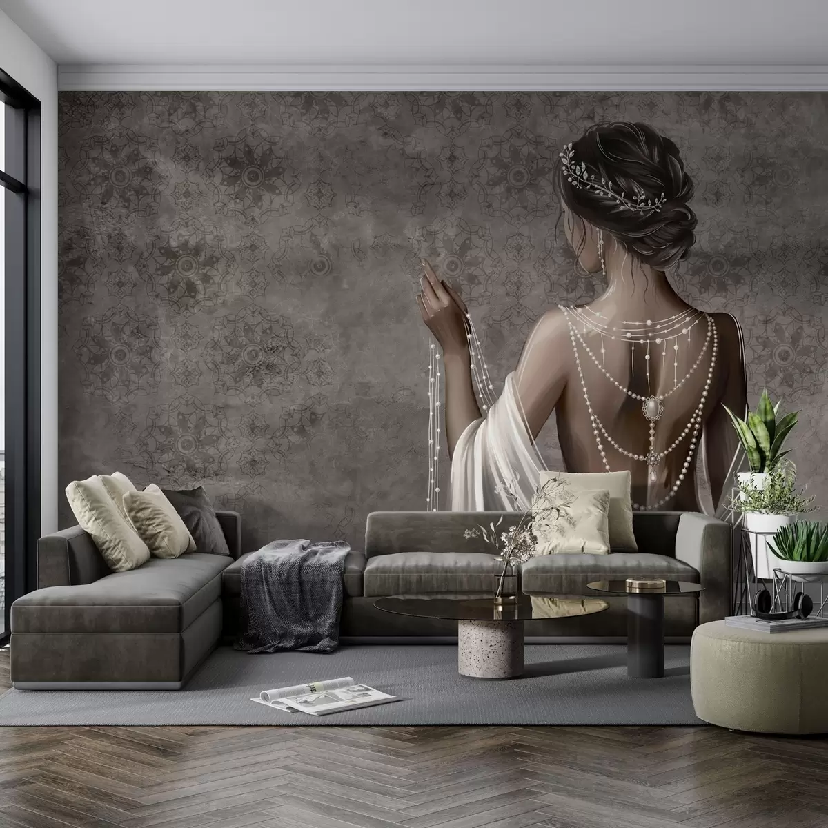 Fototapety Žena viděná zezadu s perlami, šedé pozadí s kamenným vzorem Č. w04854