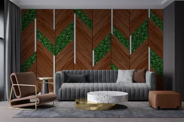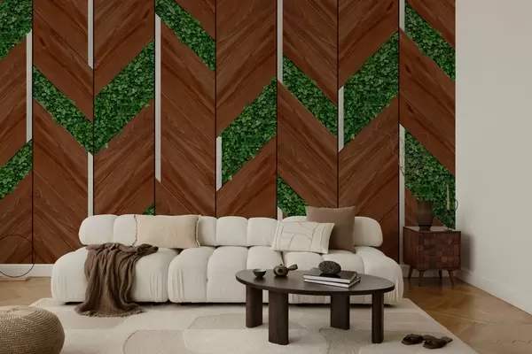 Fototapet imitace tmavých dřevěných panelů s rostlinnými vložkami w04875v1