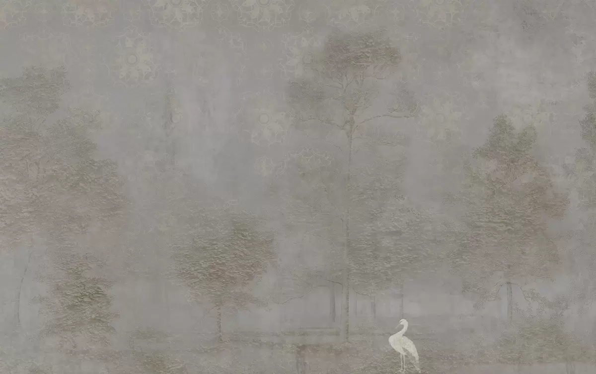 Fototapety Zamlžený les s volavkou a ornamentálním vzorem nahoře Č. w04953v1
