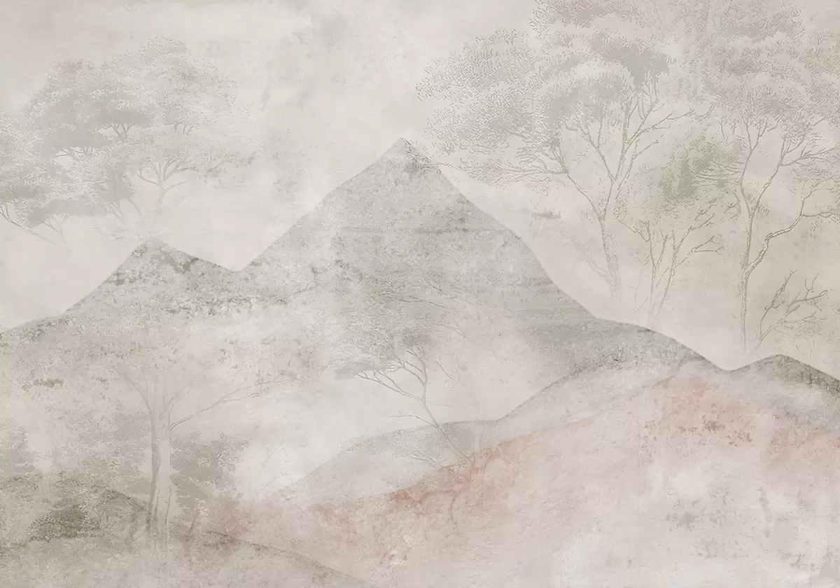 Fototapety Měkké pastelové hory a stromy v lehké mlze Č. w04954