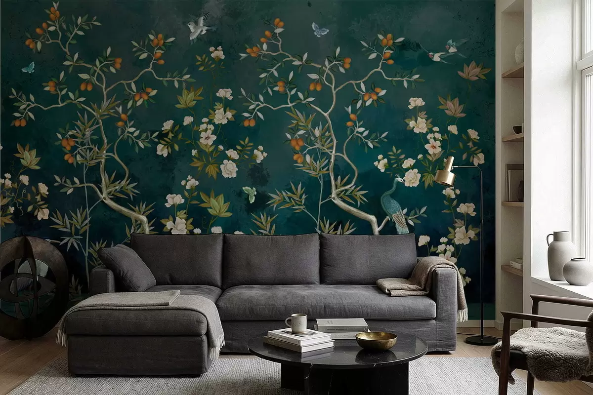 Fototapety Dekorativní scéna se stromy, květinami a ptáky na tmavém pozadí Č. w05004
