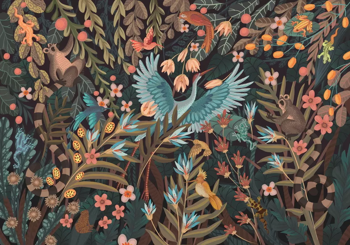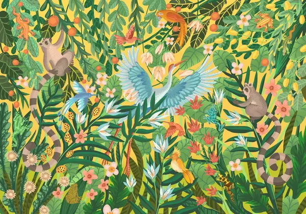 Fototapety Fantazijní scéna s ptáky a zvířaty mezi rostlinami Č. w05024