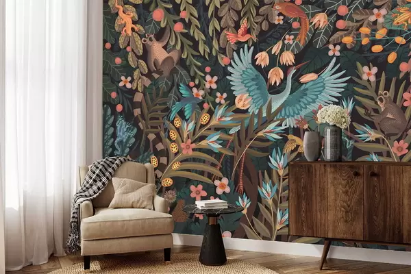 Fototapety Fantazijní scéna s ptáky a zvířaty mezi rostlinami Č. w05024