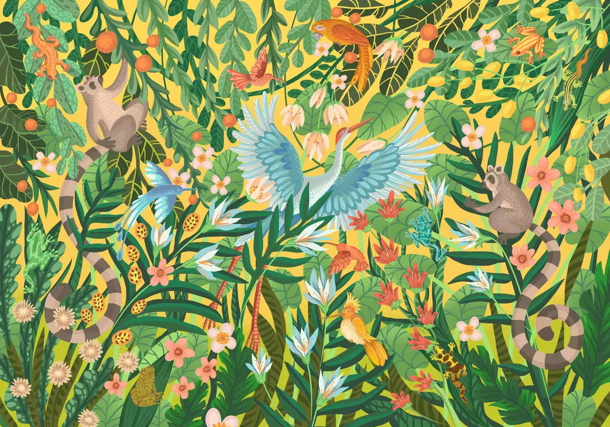 Fototapety Světlá scéna s ptáky a zvířaty v husté zeleni Č. w05024v1