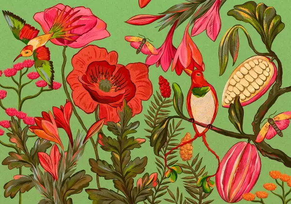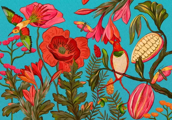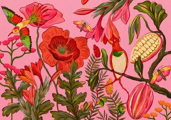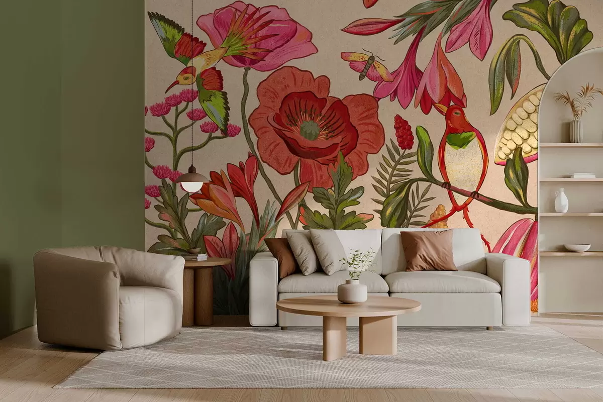 Fototapety Dekorativní květiny a ptáci na béžovém pozadí Č. w05036