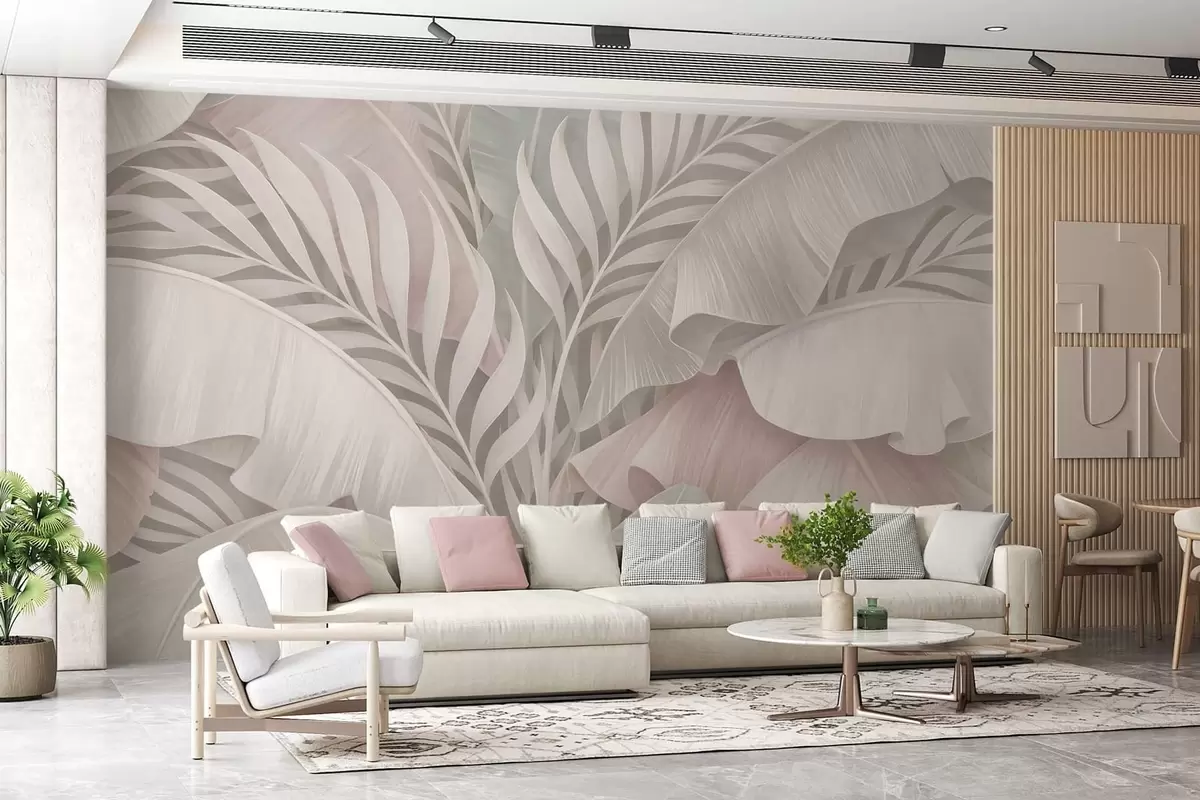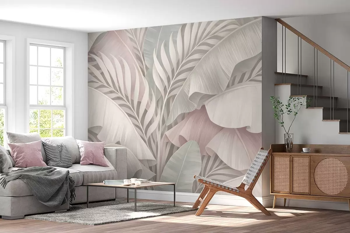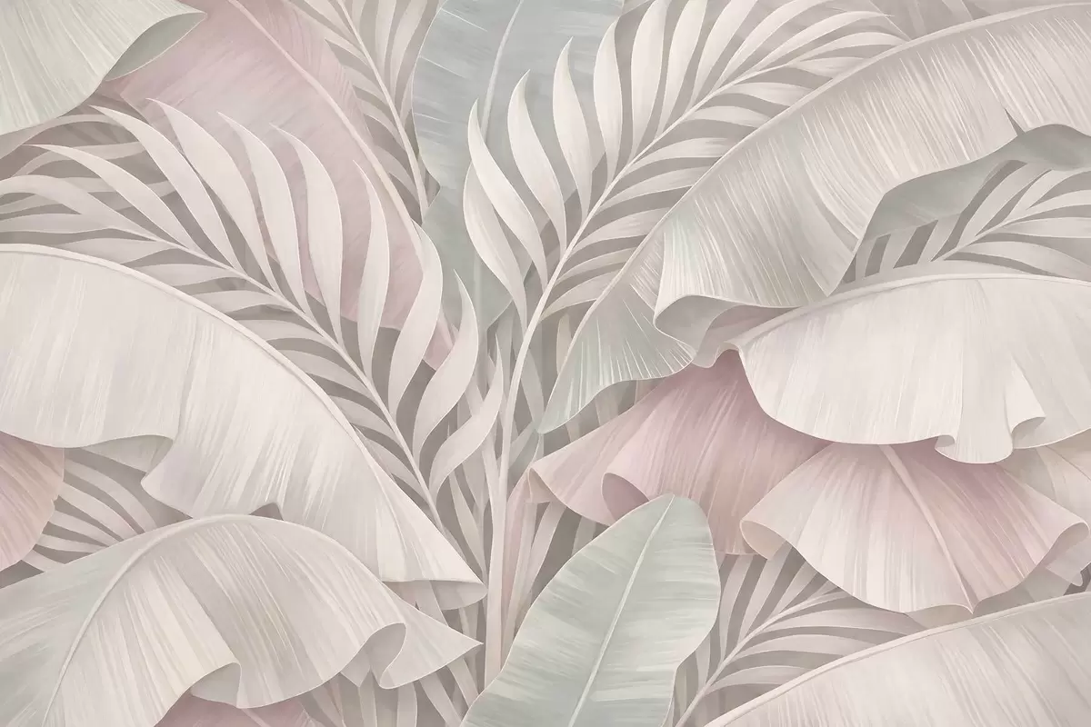 Fototapety velké tropické listy v chladných odstínech růžové a šedé Č. w05062v1