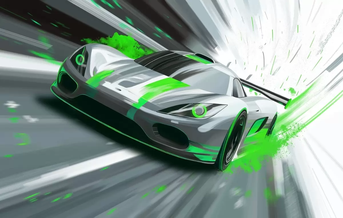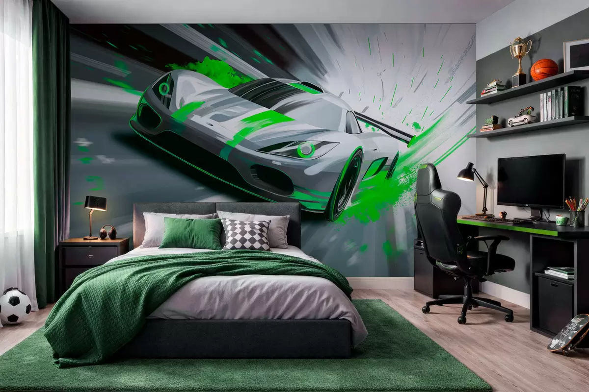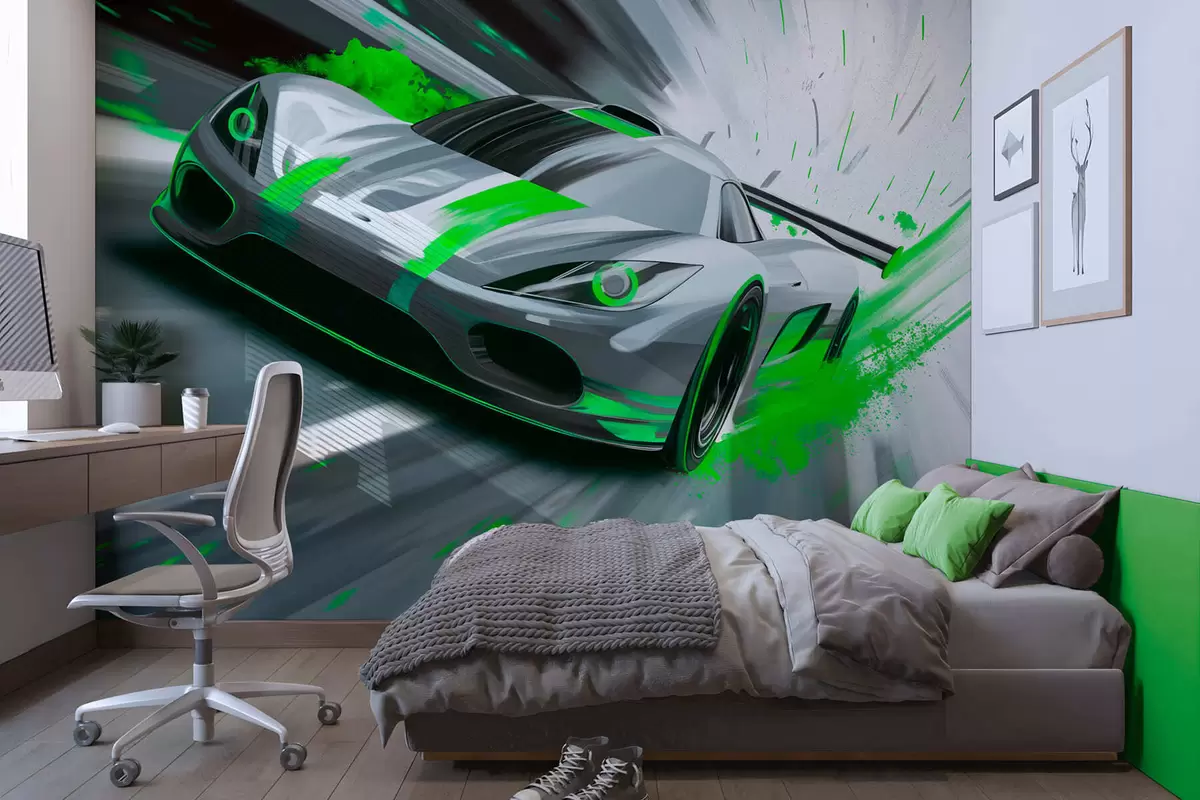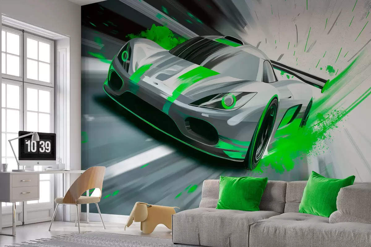 Fototapety dynamický sportovní vůz v digitálním kresebném stylu se zelenými akcenty Č. w05069v4