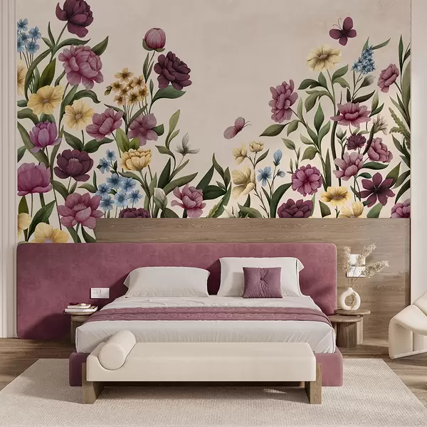 Fototapet Květinová kompozice s rostlinami a motýly na světlém pozadí w05072