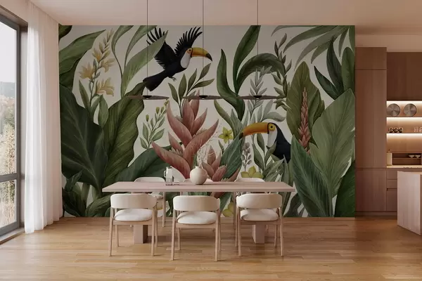 Fototapety Tropické rostliny a ptáci s velkými zobáky na světlém pozadí Č. w05088v1