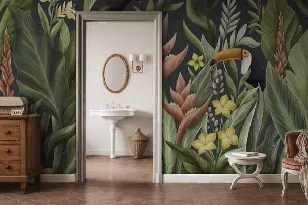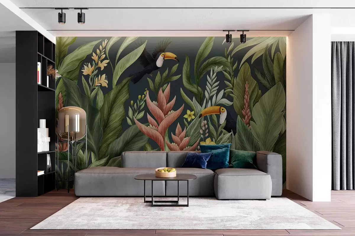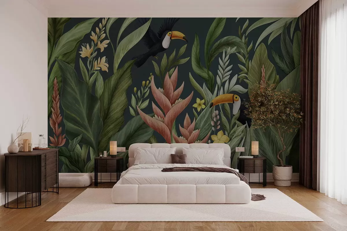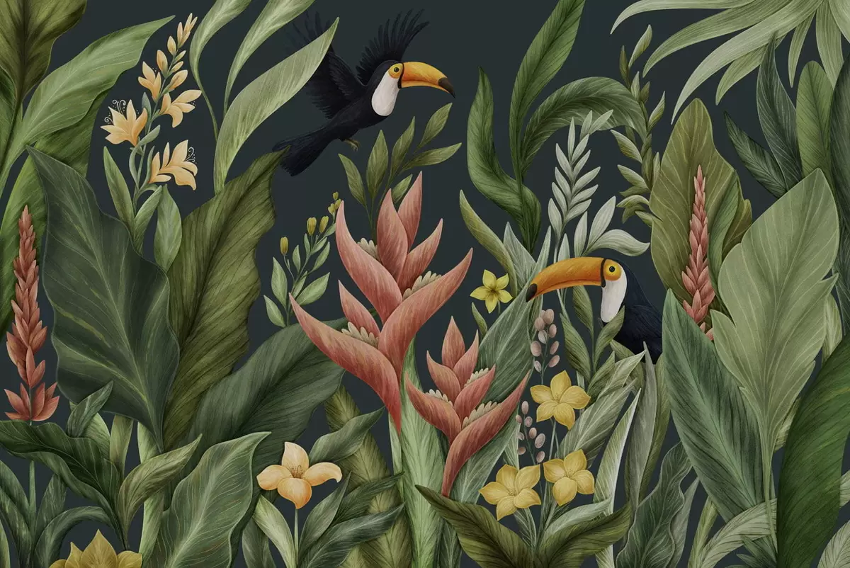 Fototapety Tropické rostliny a ptáci s velkými zobáky na tmavém pozadí Č. w05088v2