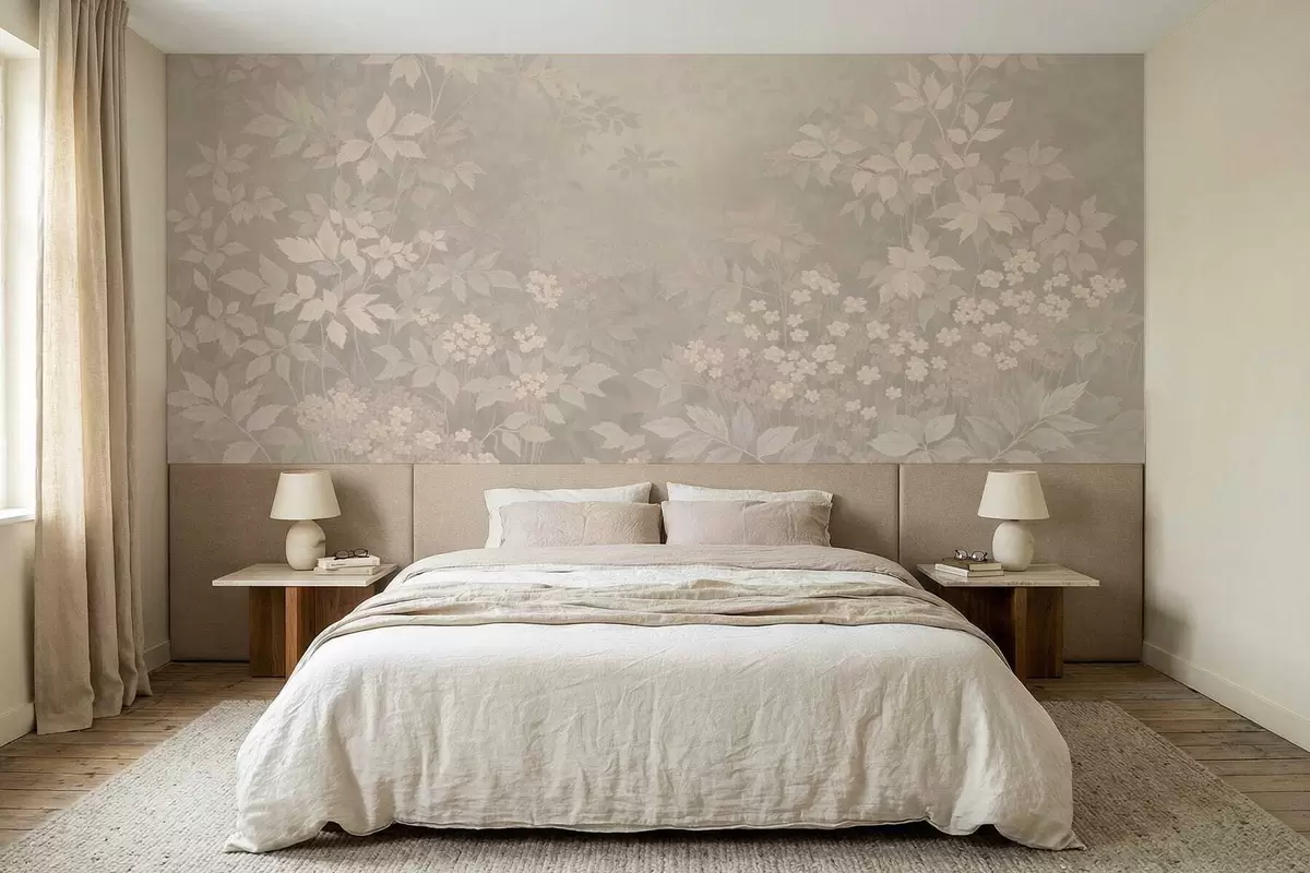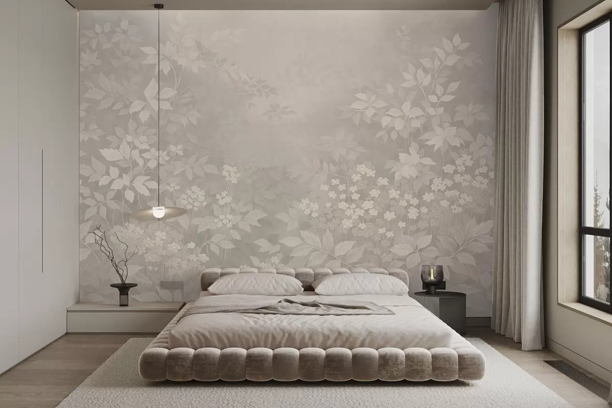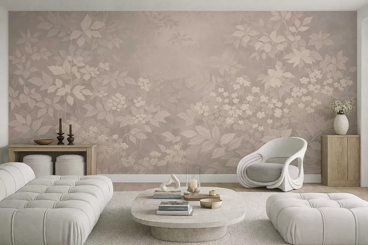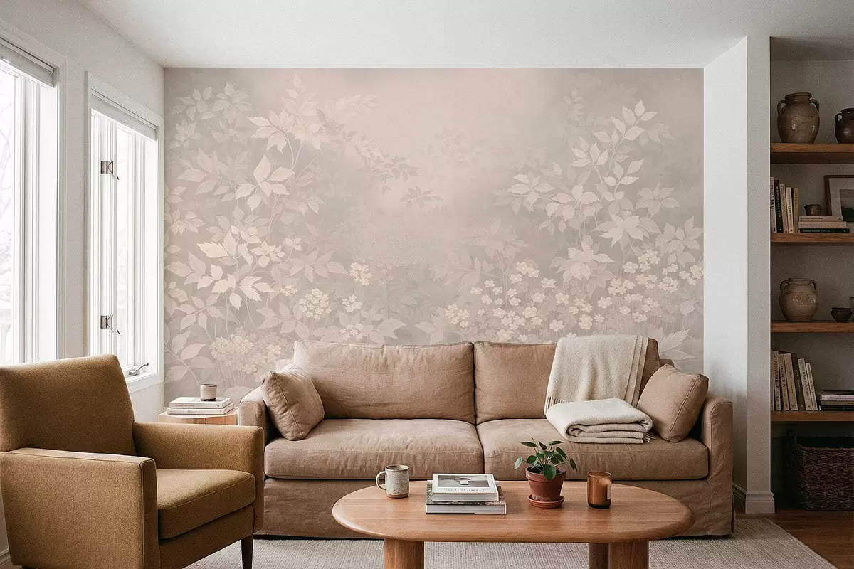 Fototapety Jemný botanický vzor s listy a květinami v mlze Č. w05115v1