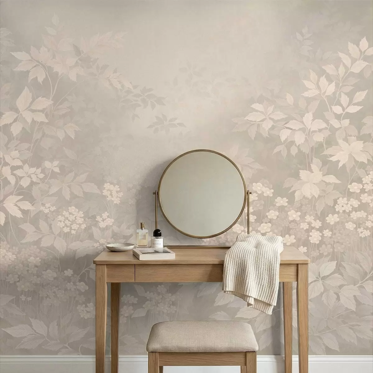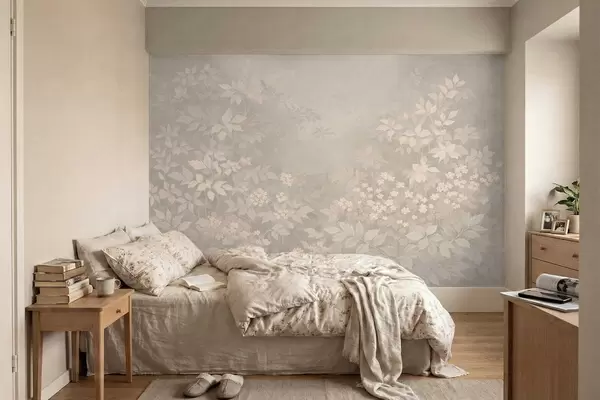Fototapety Jemný botanický vzor s listy a květinami v mlze Č. w05115v1