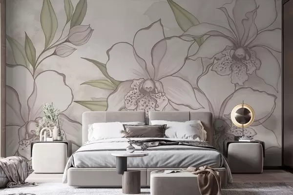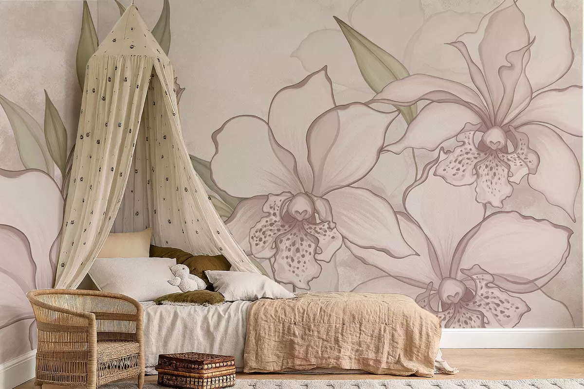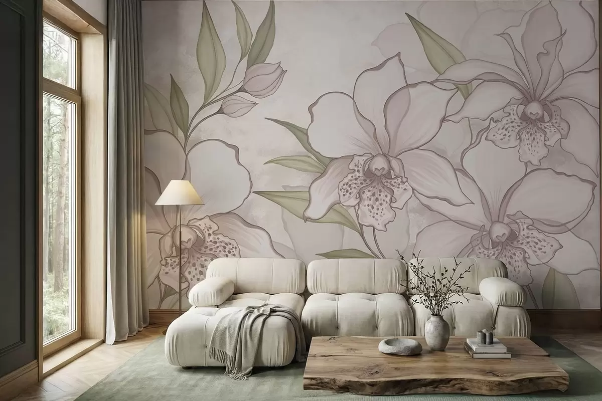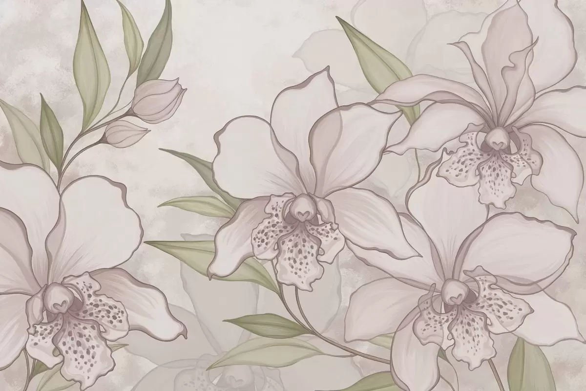 Fototapety Ilustrace bledých orchidejí s listy na béžovém pozadí Č. w05117