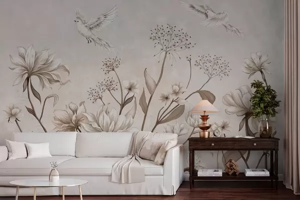 Fototapety Světlé květiny a ptáčci na jemném pozadí Č. w05118