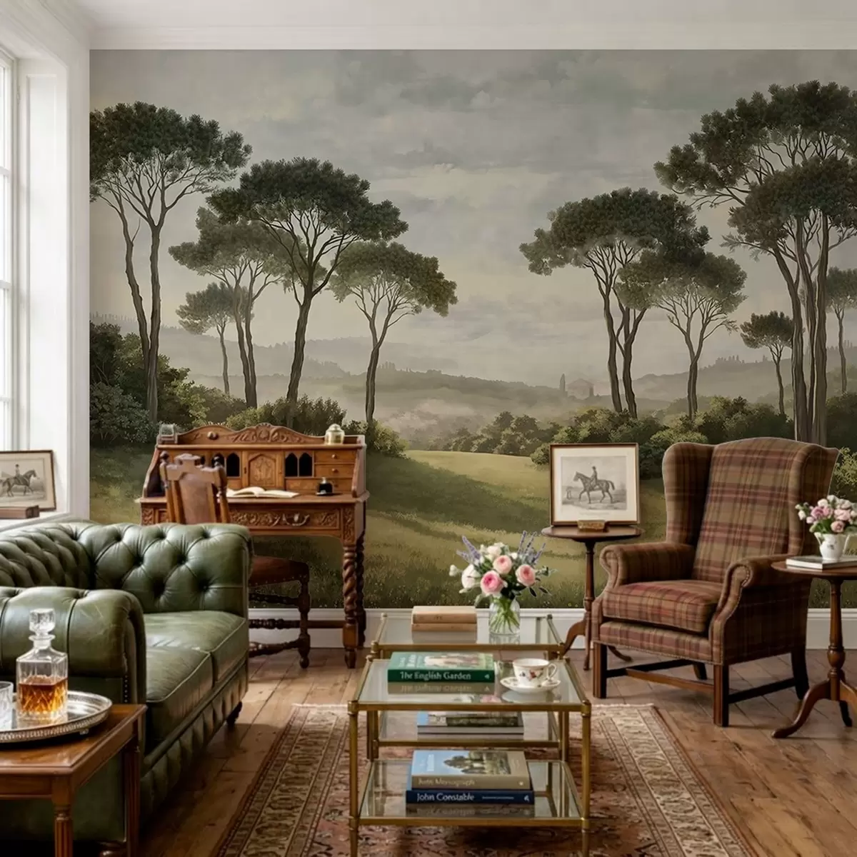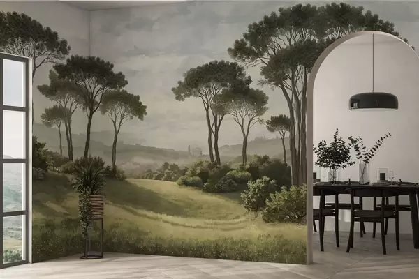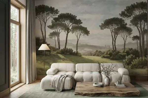 Fototapety Krajina se stromy, loukou a mlhou v dálce Č. w05122v1