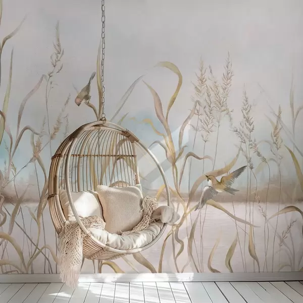 Fototapety Ilustrace rákosí a ptáků u vody v jemných tónech Č. w05125