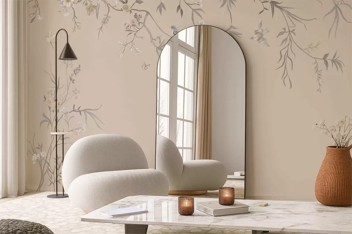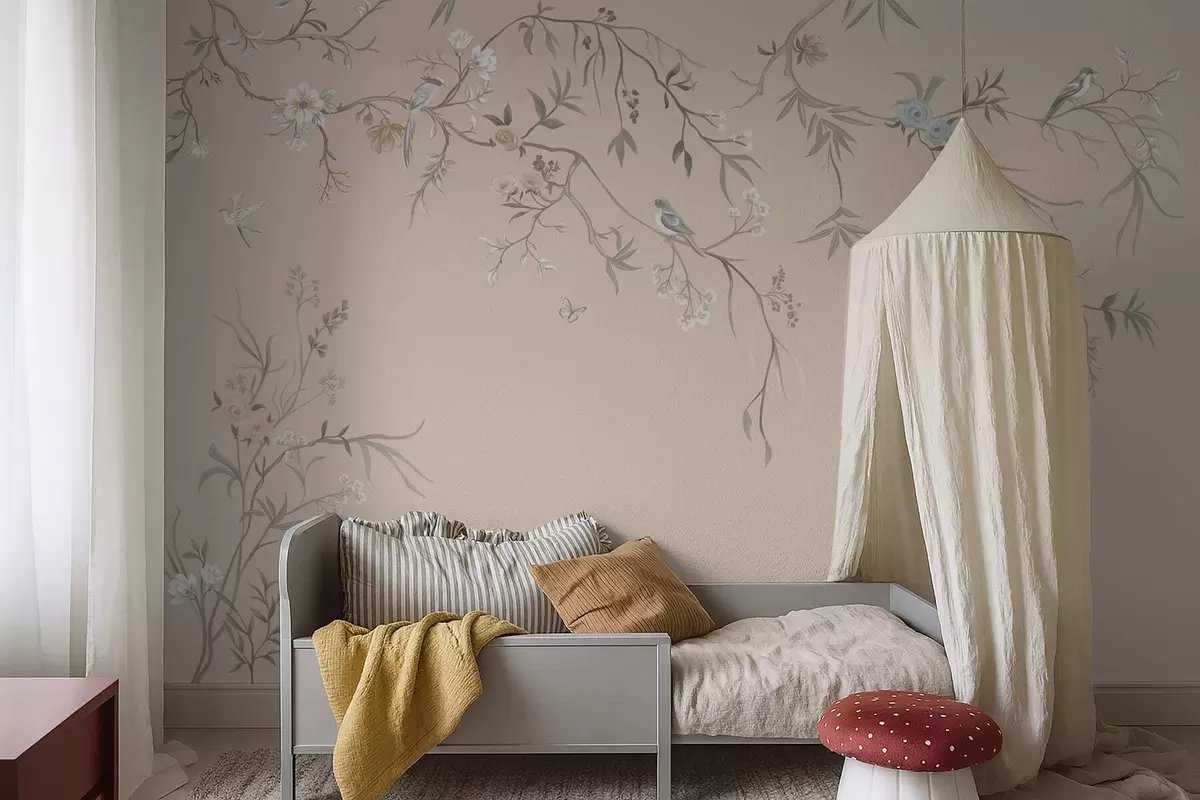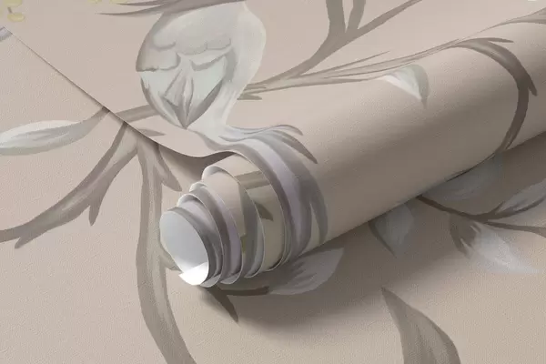 Fototapety Květinové větve s ptáky na teplém béžovém pozadí Č. w05127v1
