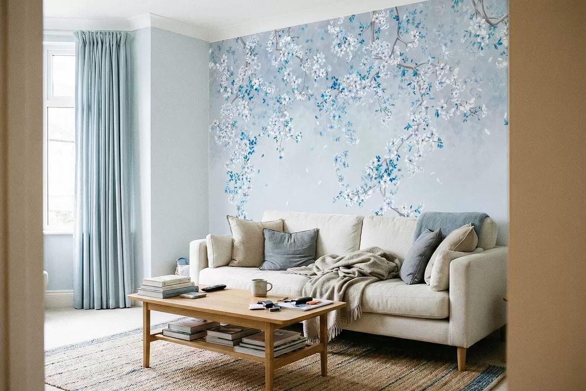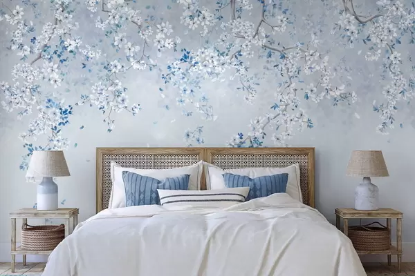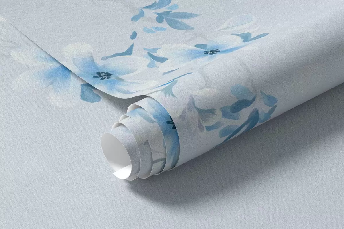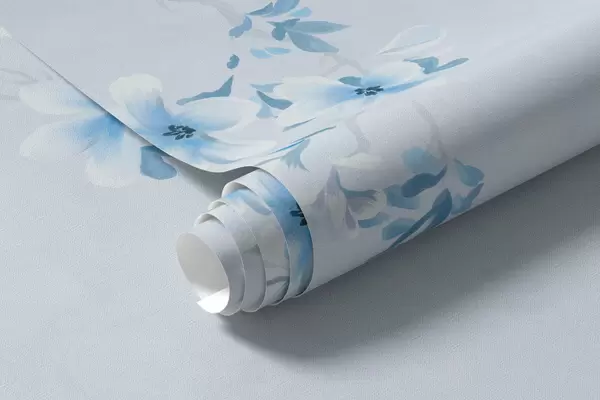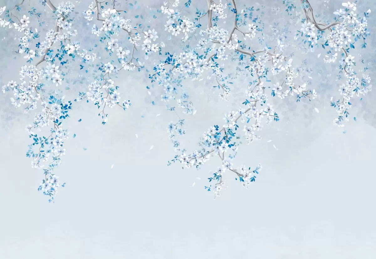 Fototapety Větve s bílými a modrými květy na chladném pozadí Č. w05129v2