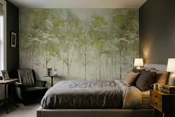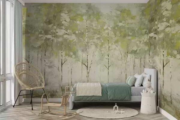 Fototapety Stylizovaný les se štíhlými stromy v zelených tónech Č. w05221v1
