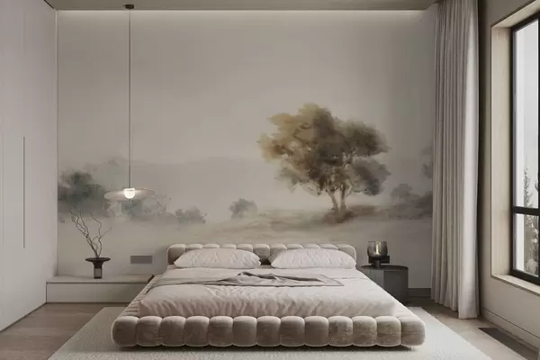 Fototapety Minimalistická krajina s osamělým stromem v mlze Č. w05223