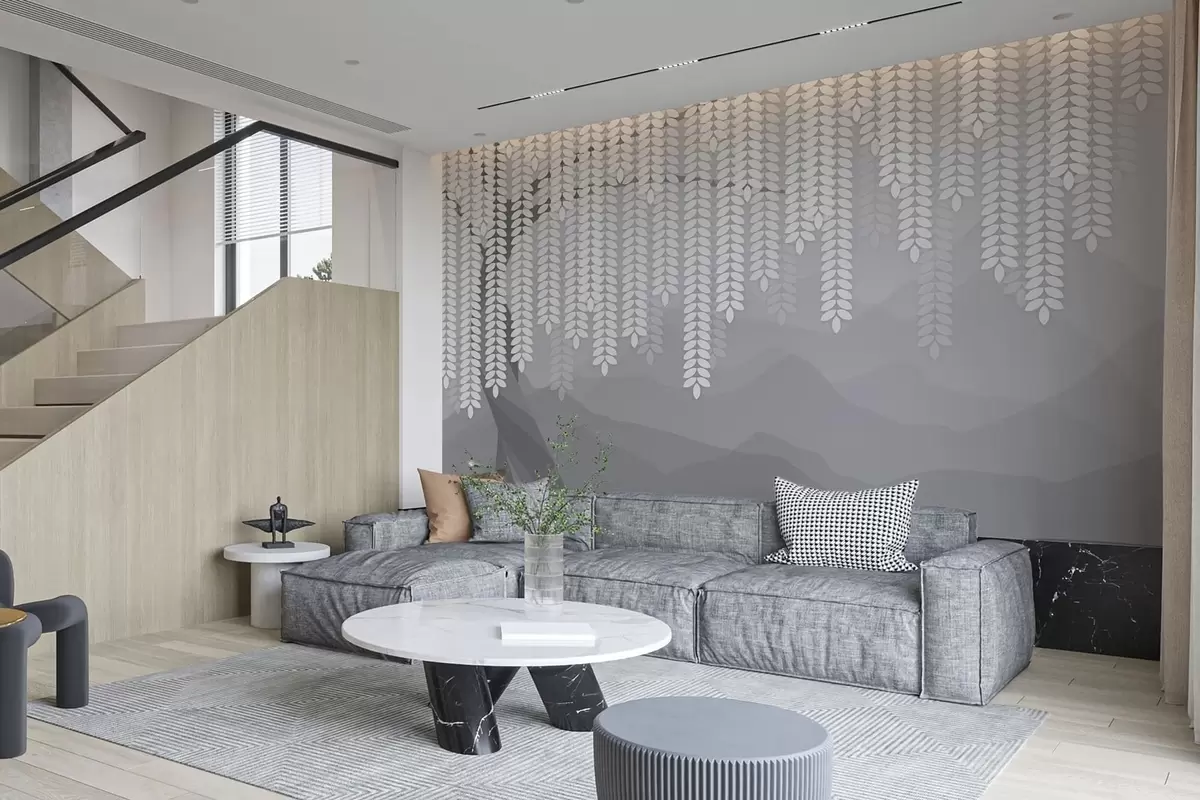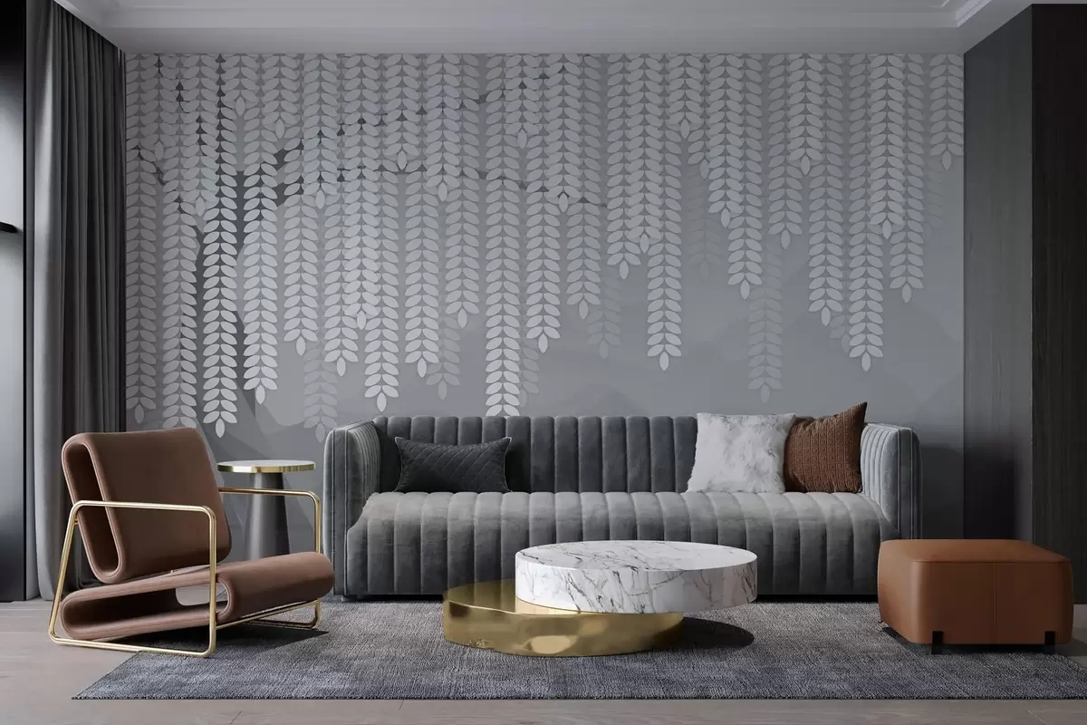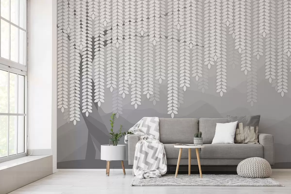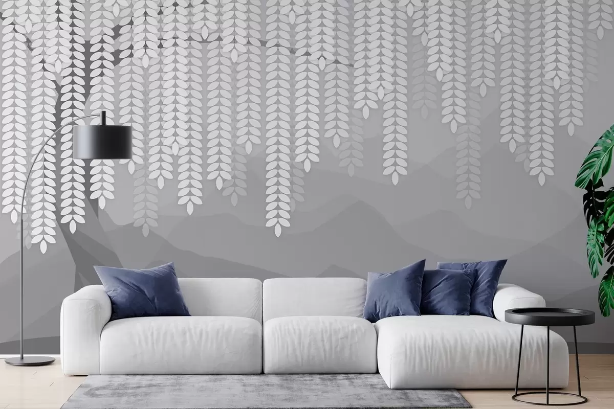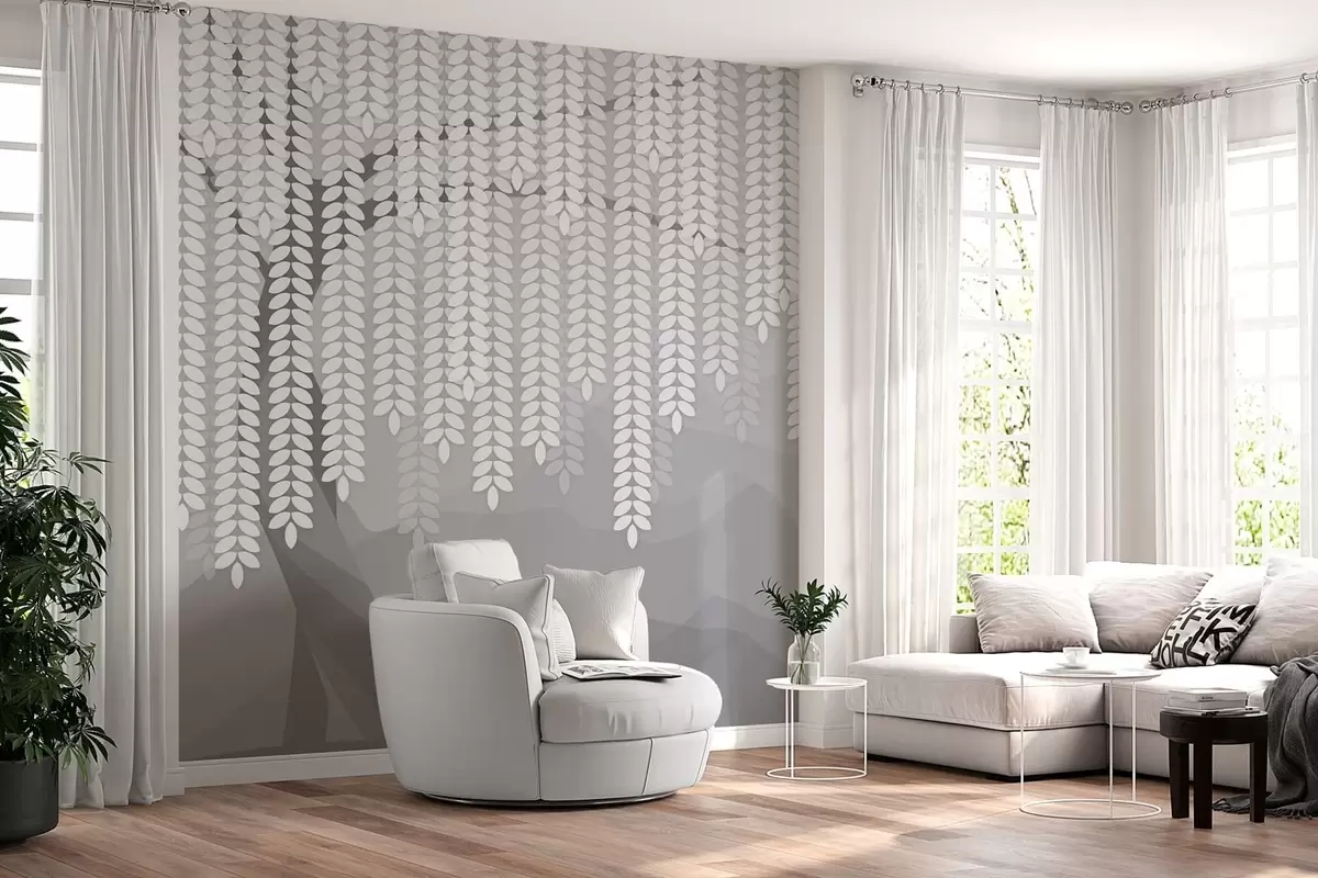 Fototapety stylizovaný vrbový strom s visícími listy na pozadí minimalistických hor v odstínech šedé Č. w05232v3