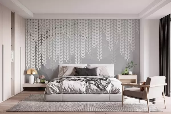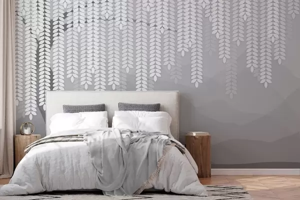 Fototapety stylizovaný vrbový strom s visícími listy na pozadí minimalistických hor v odstínech šedé Č. w05232v3