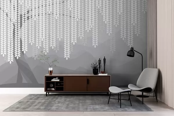 Fototapet stylizovaný vrbový strom s visícími listy na pozadí minimalistických hor v odstínech šedé w05232v3
