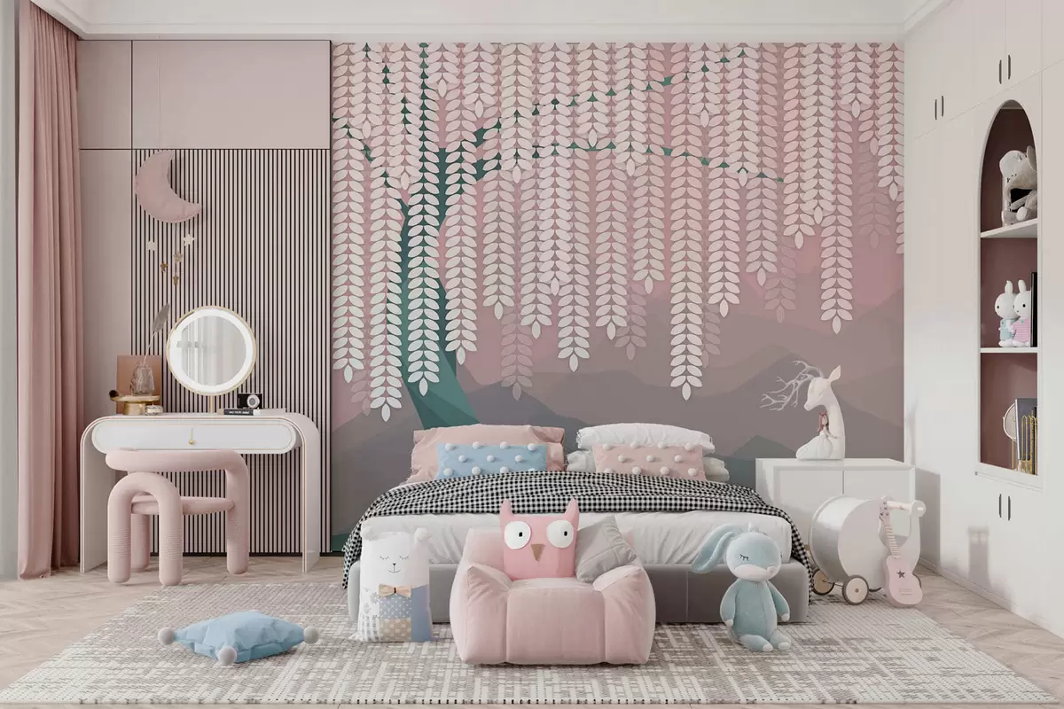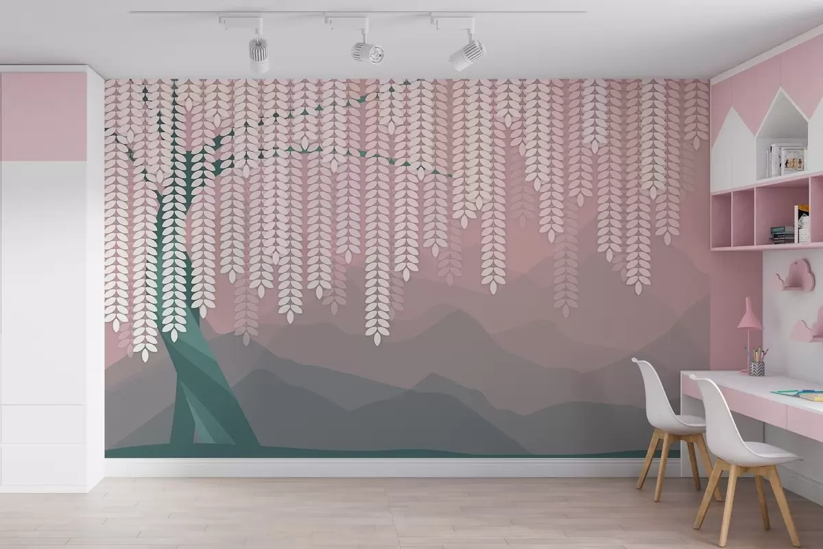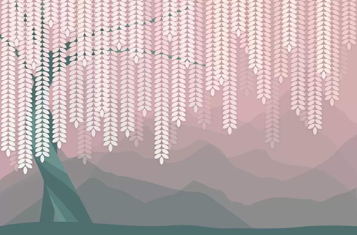 Fototapety stylizovaný vrbový strom s visícími listy na pozadí minimalistických hor v odstínech růžové a tmavě zelené barvy Č. w05232v4