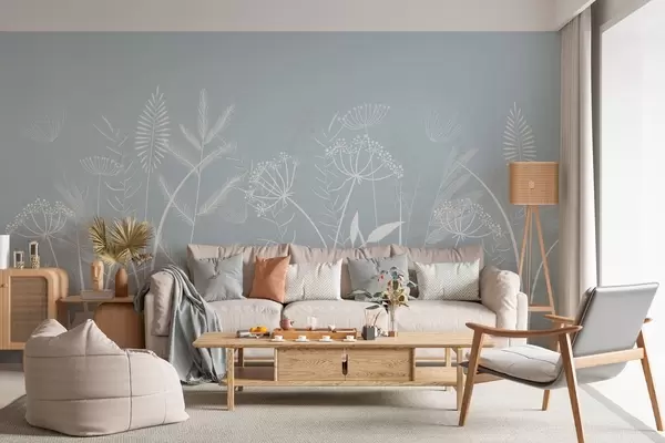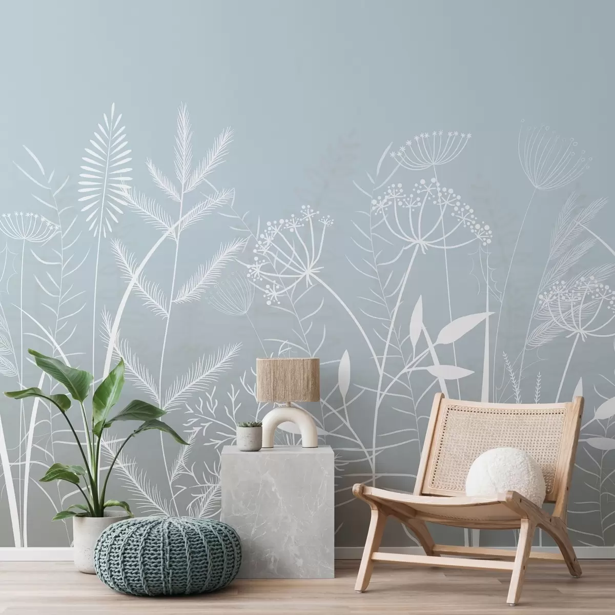 Fototapety jemné ručně malované divoké trávy a květiny na šedomodrém pozadí Č. w05383