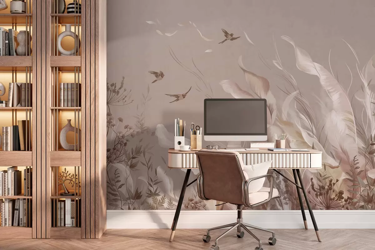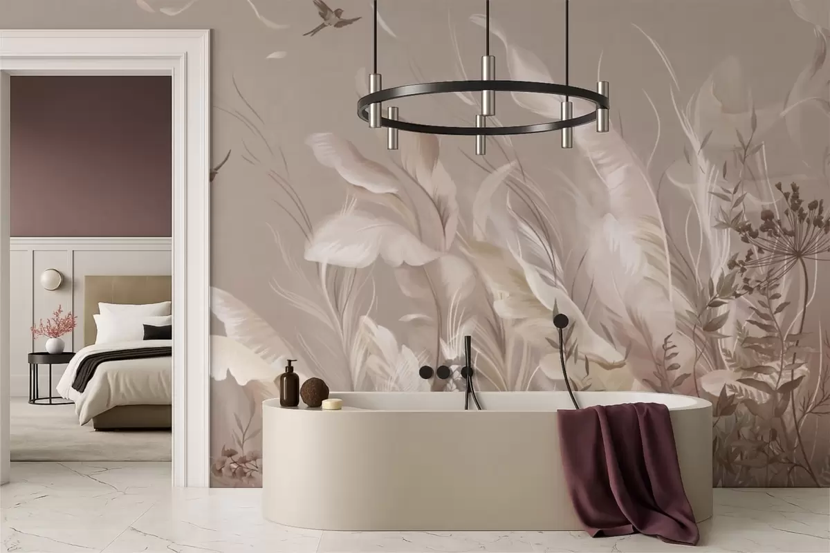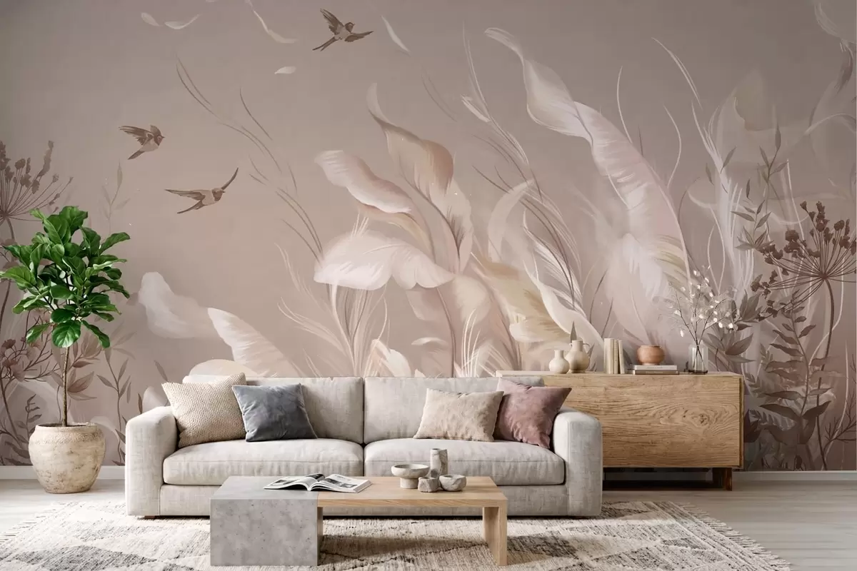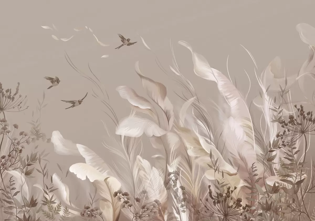 Fototapety Lehká peříčka a rostliny s ptáčky v pastelových barvách Č. w05395v1