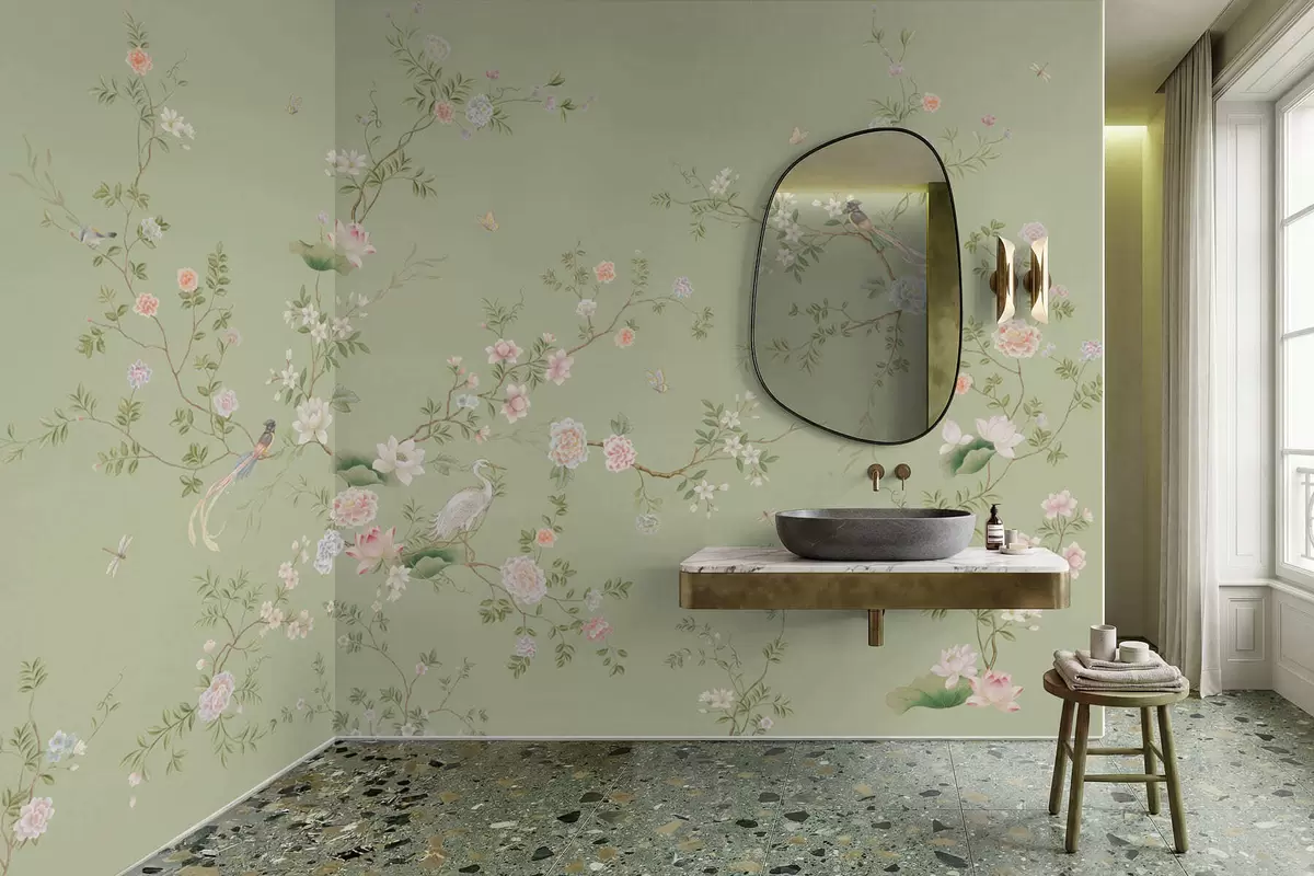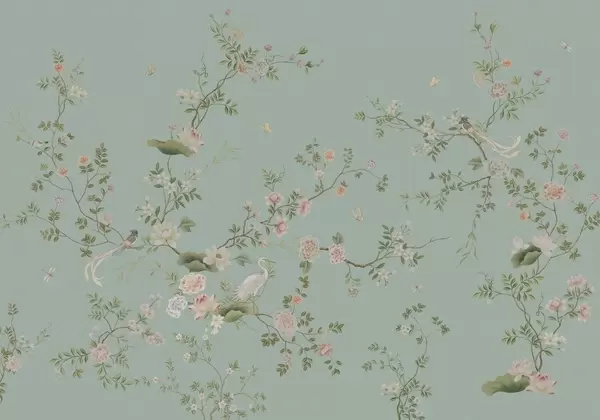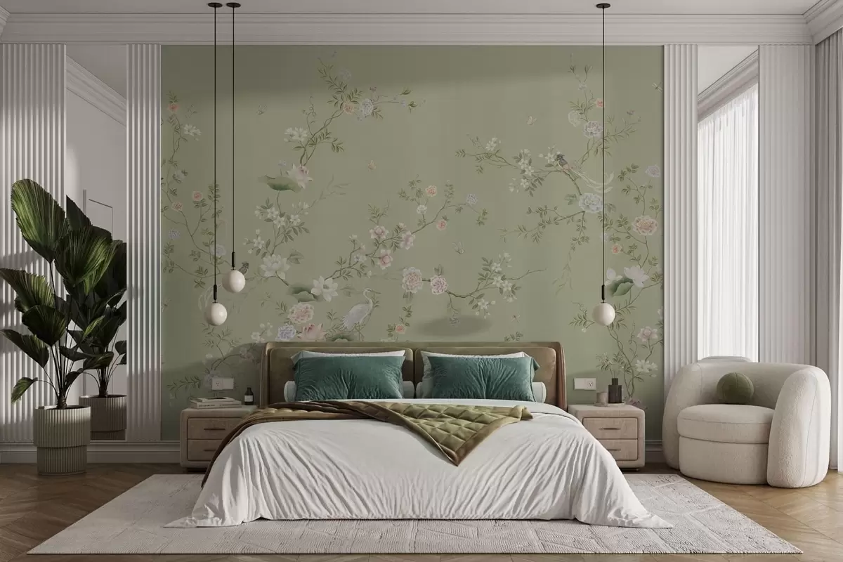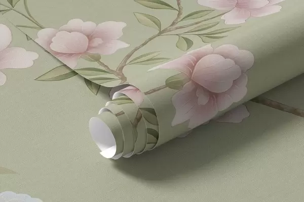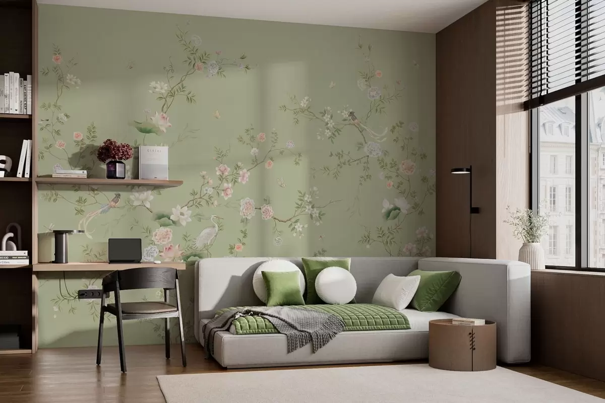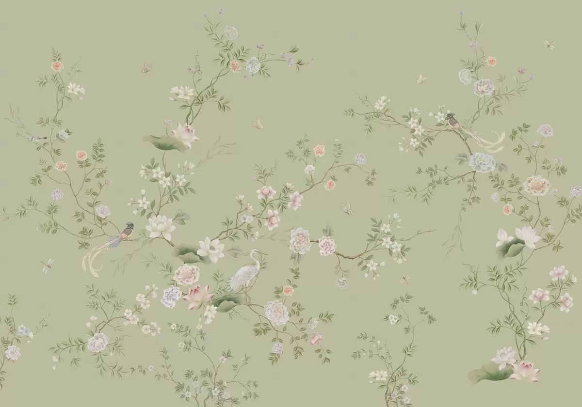 Fototapety Kvetoucí větve s ptáky na světle zeleném pozadí Č. w05416