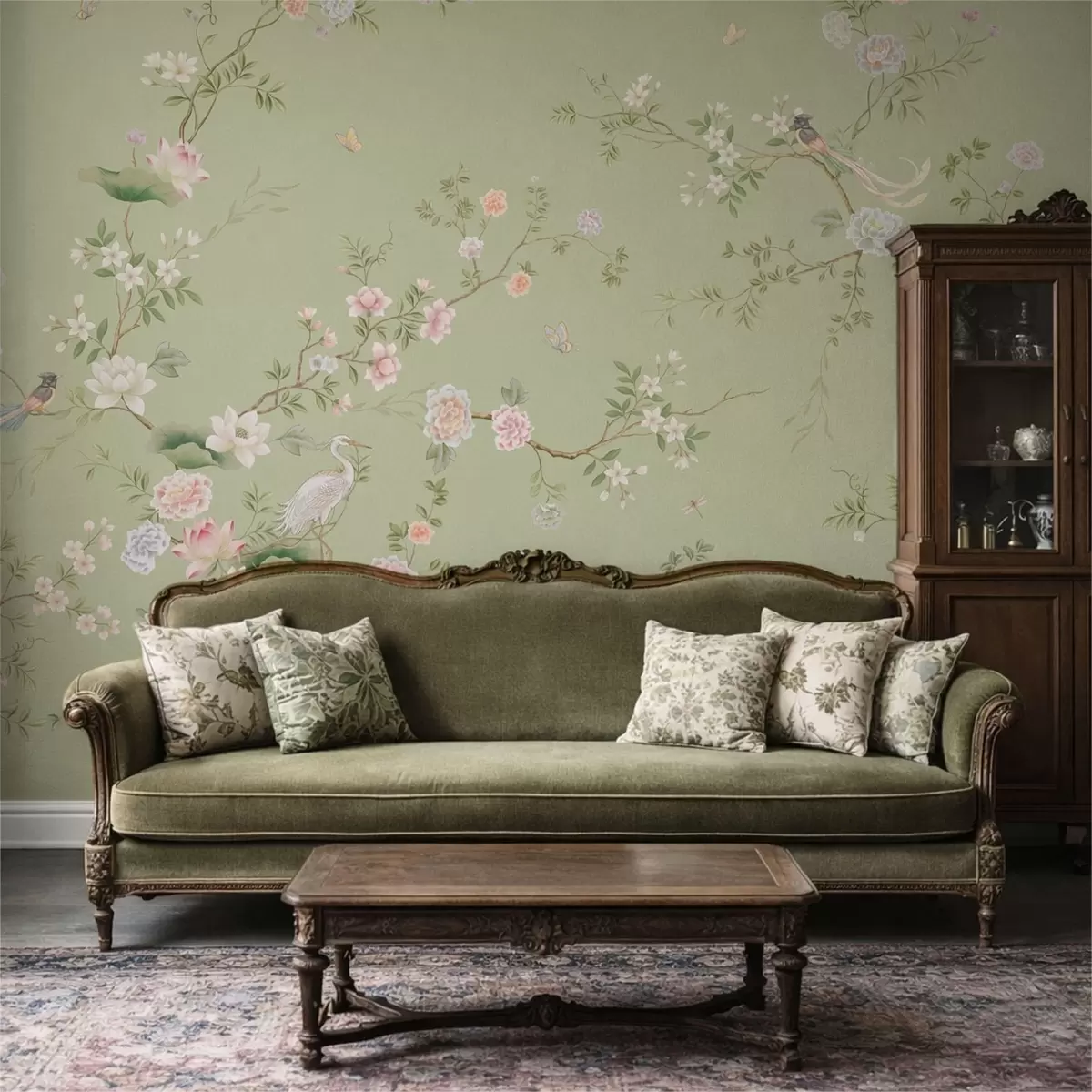 Fototapety Kvetoucí větve s ptáky na světle zeleném pozadí Č. w05416