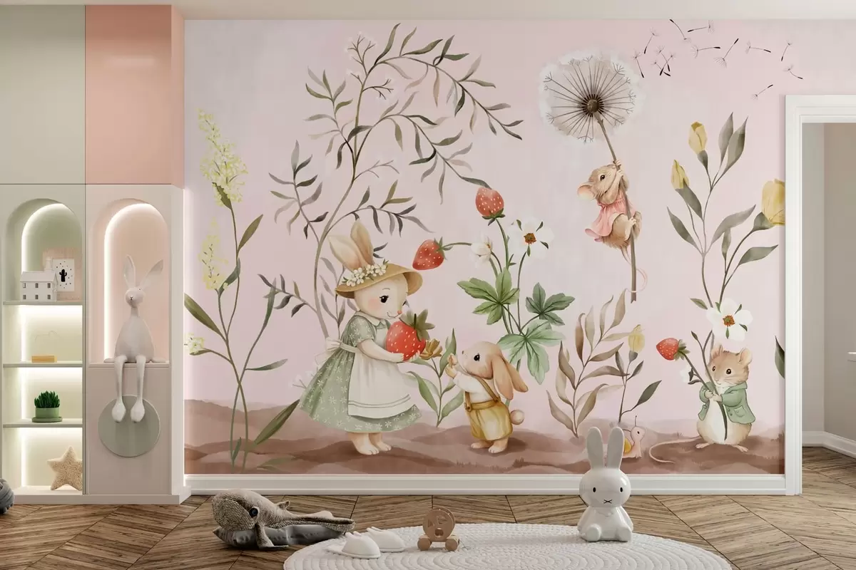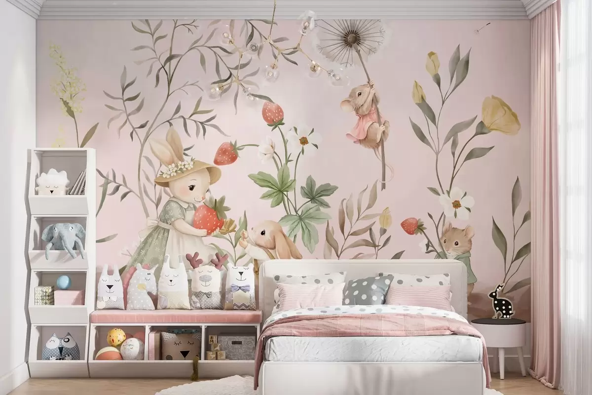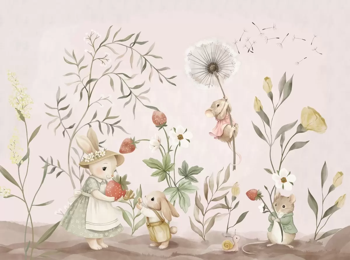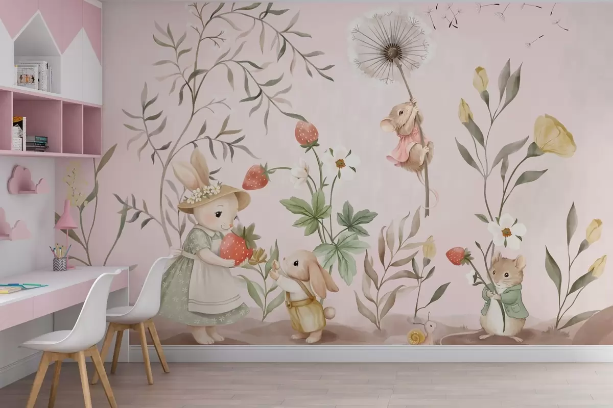 Fototapety Ilustrace zvířat s jahodami na jemně růžovém pozadí Č. w05422v1