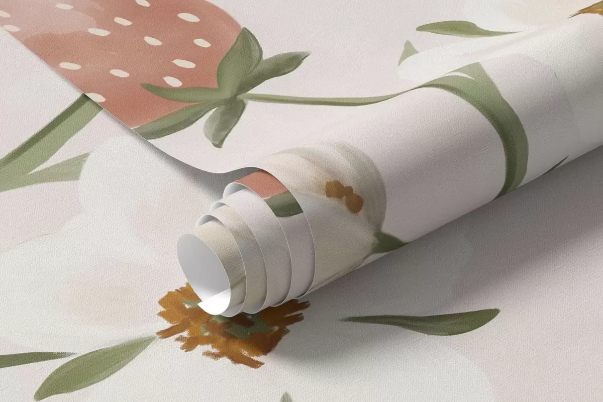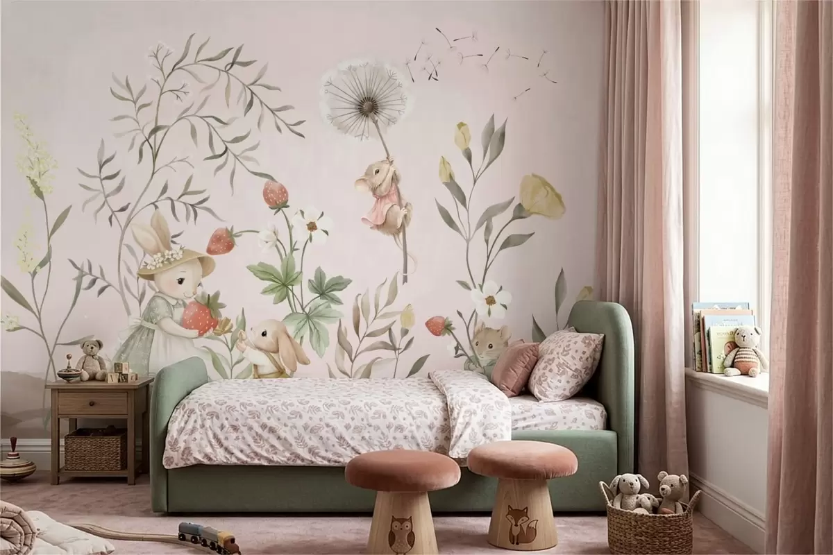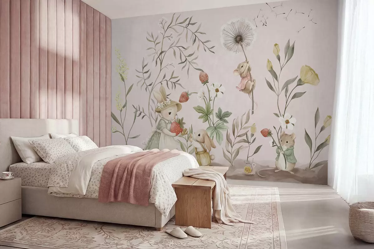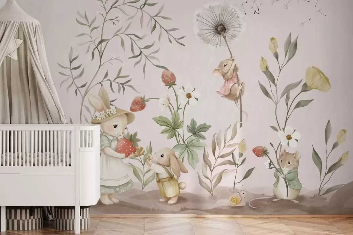 Fototapety Ilustrace zvířat s jahodami na jemně růžovém pozadí Č. w05422v1