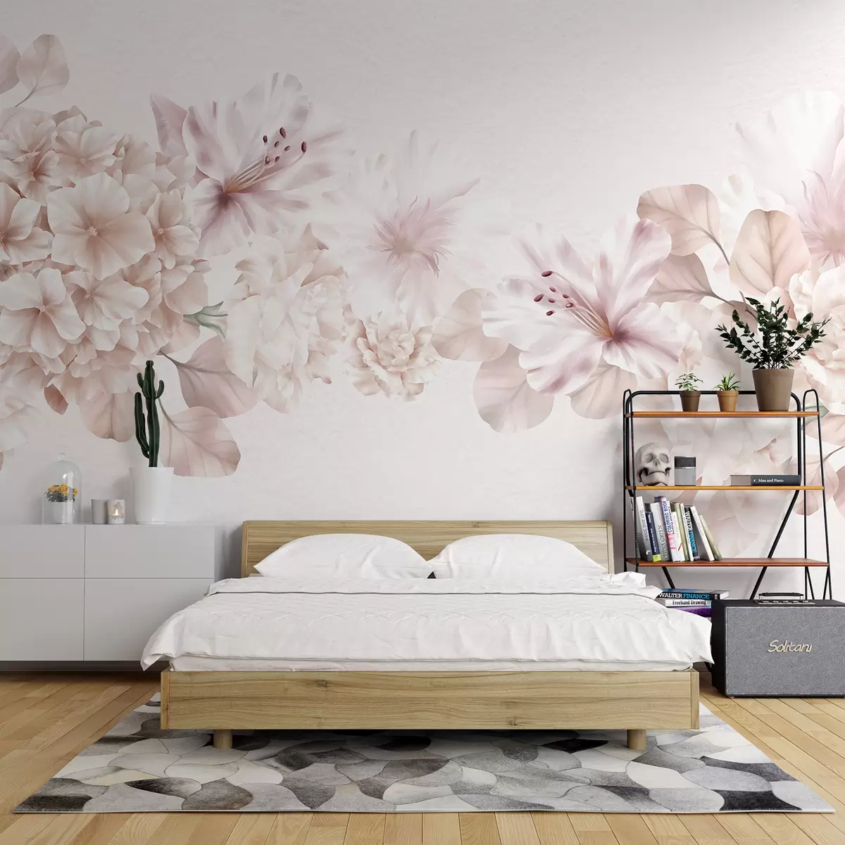 Fototapety Jemné růžové a bílé květinové aranžmá s jemnými okvětními lístky a květy na světlém pozadí Č. w07923
