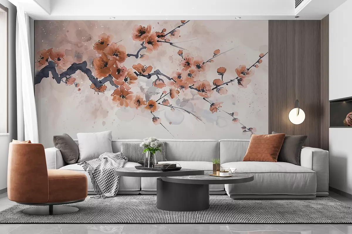 Fototapety Větev rozkvetlých červených třešňových květů na měkkém, zamlženém pozadí s nádechem modré a šedé Č. w07985