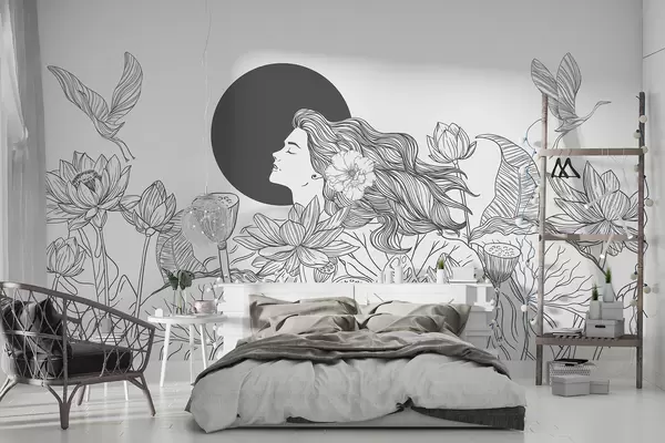 Fototapety Žena v přírodě, perokresba, lotosové květy, velké listy, létající ptáci, šedá barva Č. w07988v2