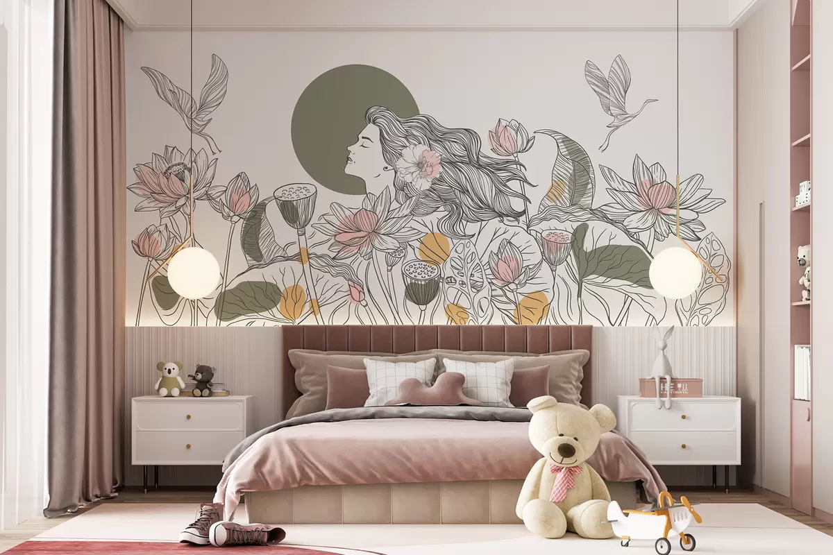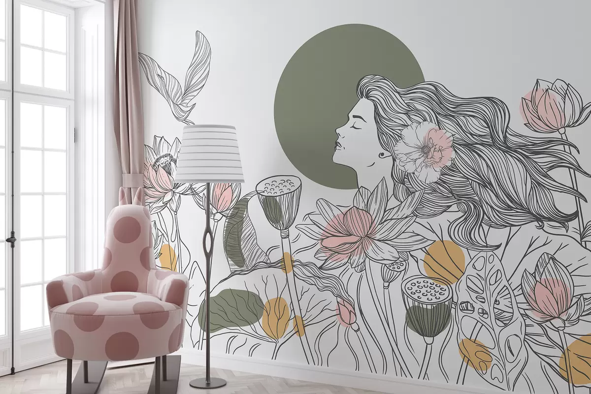 Fototapety Žena v přírodě, perokresba, lotosové květy, velké listy, létající ptáci, pastelové barvy Č. w07988v6