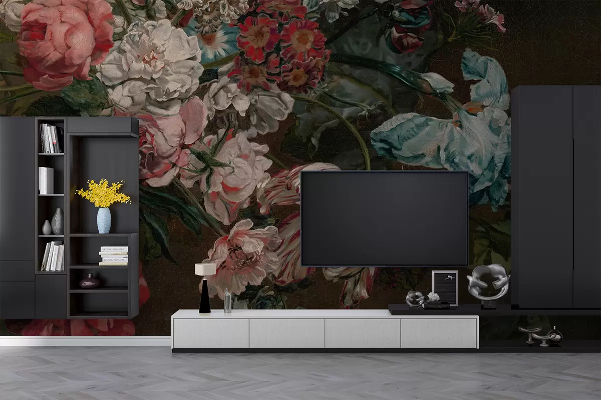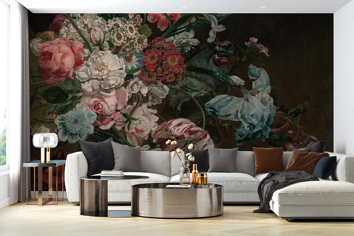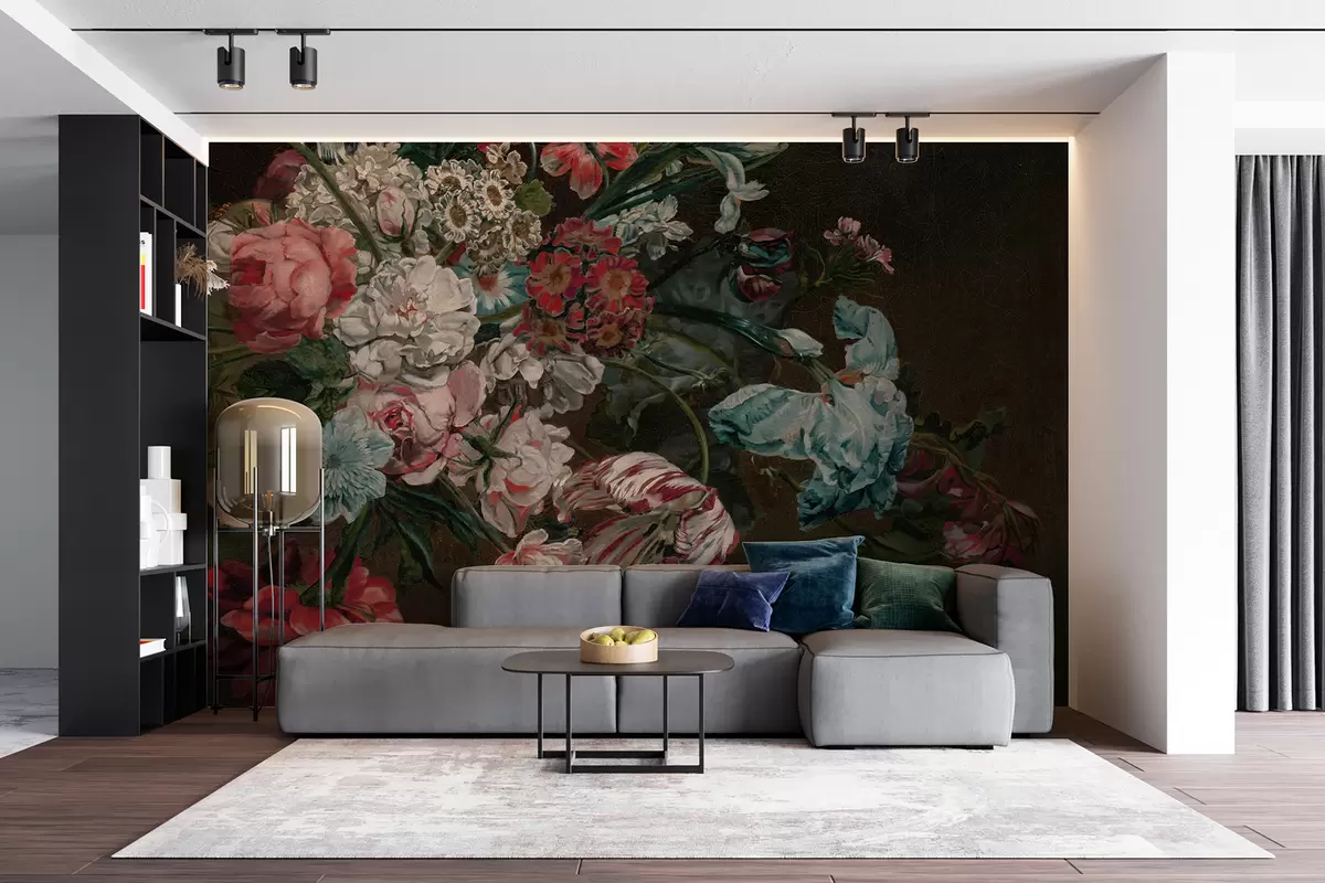 Fototapety Vintage barevné květiny včetně růžových pivoněk, červených karafiátů a bílých lilií na tmavém pozadí Č. w08163