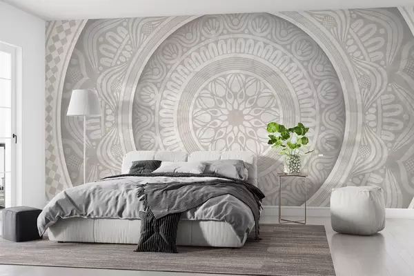 Fototapety Detailní symetrický šedobílý potisk mandaly se soustřednými kruhy a geometrickými tvary Č. w08182