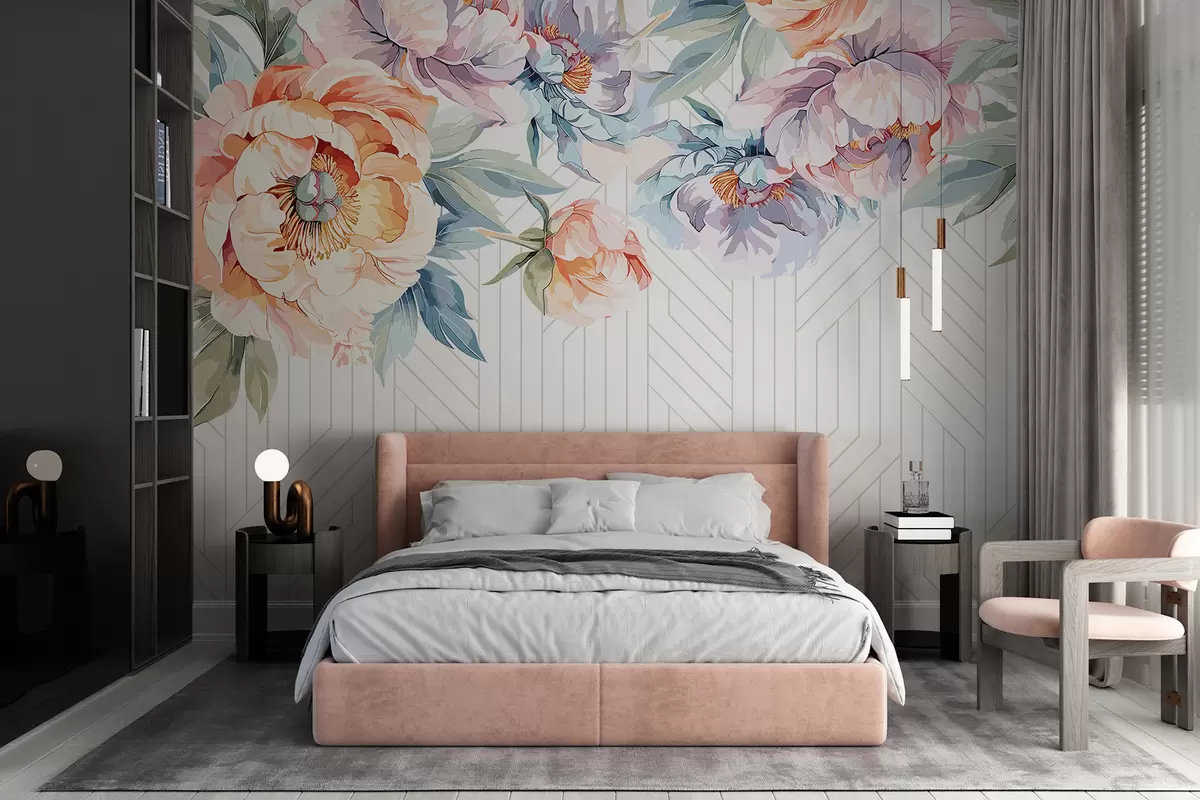 Fototapety Zářivá broskev a růžové abstraktní pivoňky se zelenými listy na pozadí bílého a šedého vzoru Č. w08183