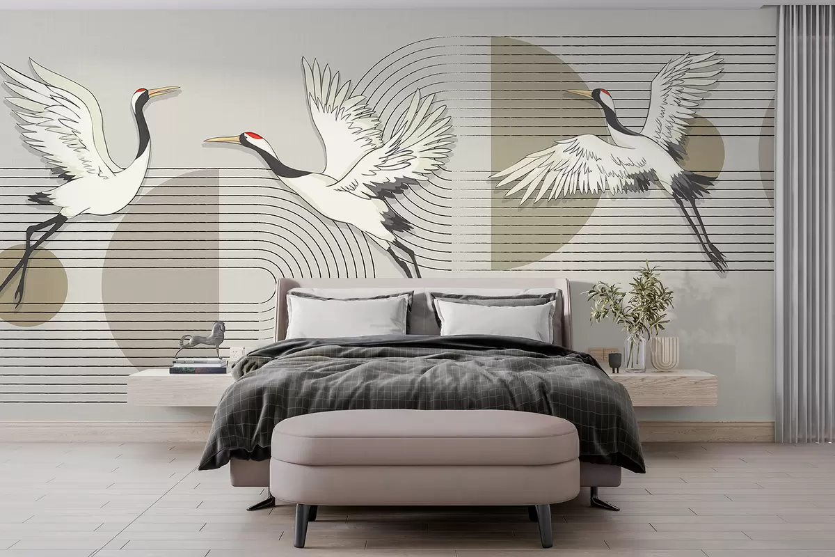 Fototapety Tři bílé jeřáby v letu na geometrickém minimalistickém pozadí se soustřednými kruhy Č. w08188