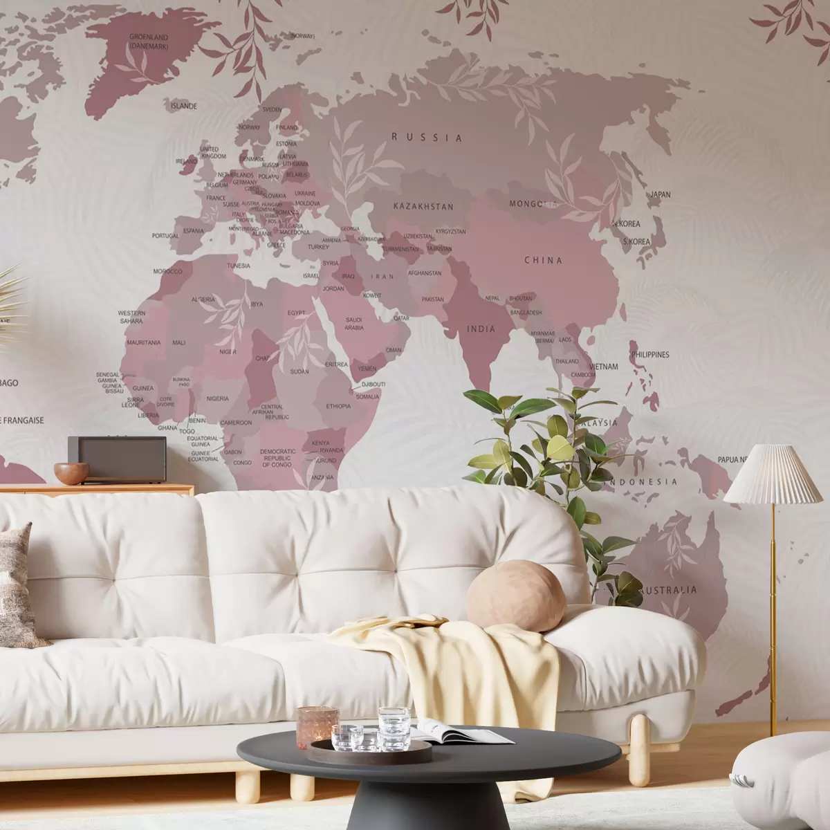 Fototapety Stylová mapa světa s růžovými listy a rostlinami Č. w08211v3