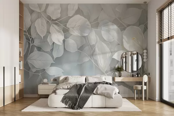 Fototapety Měkké, jemné bílé květy s šedozelenými listy na rozmazaném pozadí, vytvářející klidnou atmosféru Č. w08232