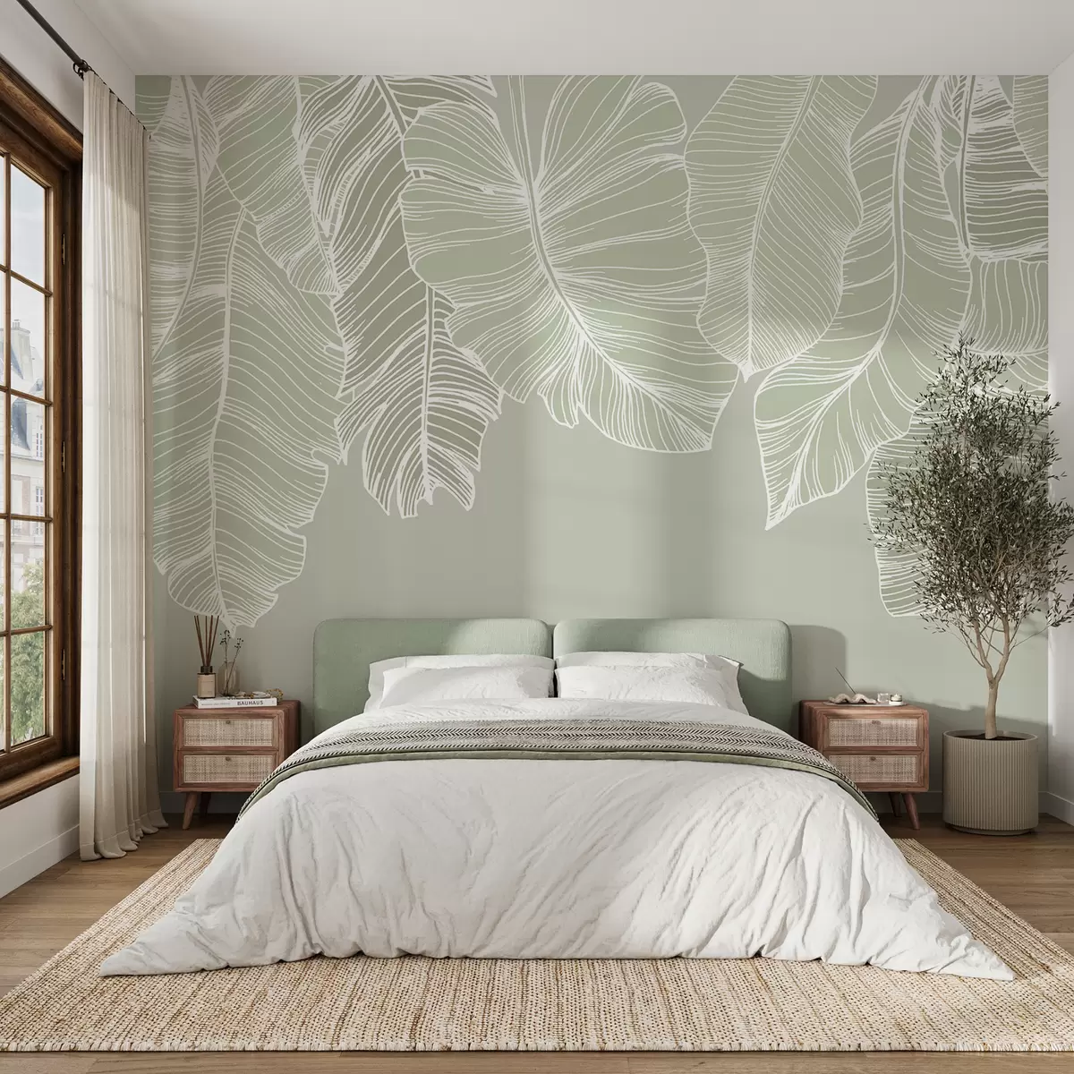 Fototapety Bílé tropické květinové listy se světle zeleným pozadím, minimalistický design Č. w08235v1