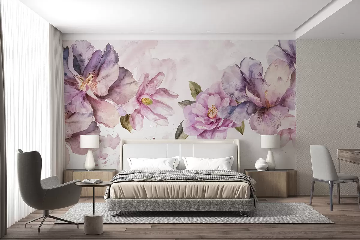 Fototapety Jemné růžové a fialové akvarelové květy s měkkými okvětními lístky a zelenými listy na světlém pozadí Č. w08238