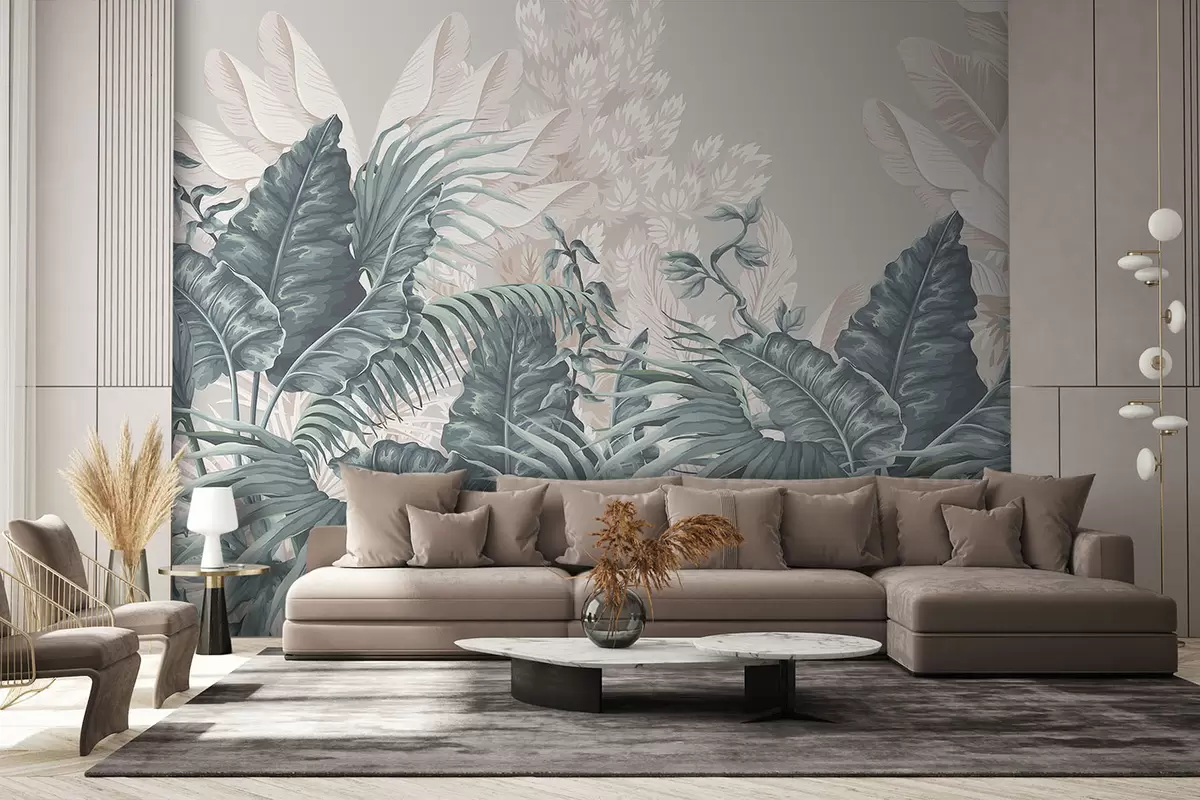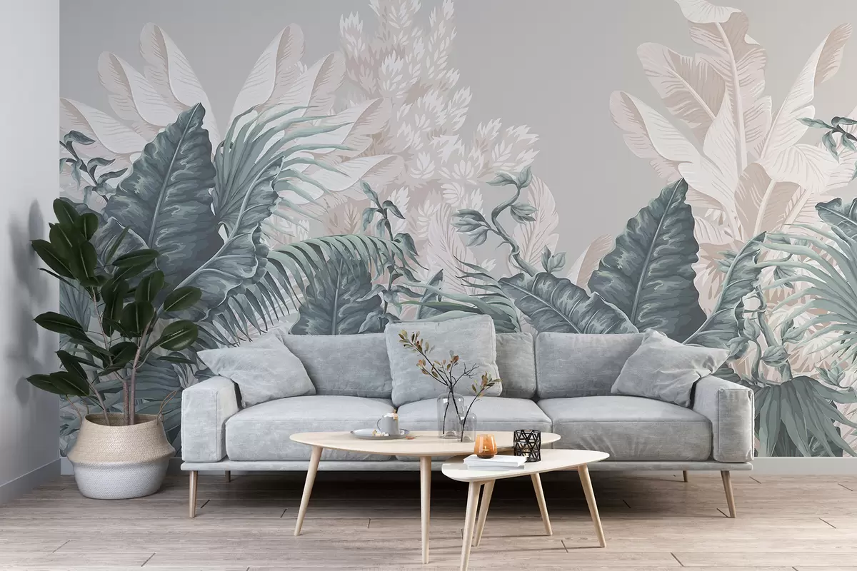 Fototapety Scéna z tropické džungle s velkými zelenými listy a květy v popředí, vytvářející svěží atmosféru Č. w08242